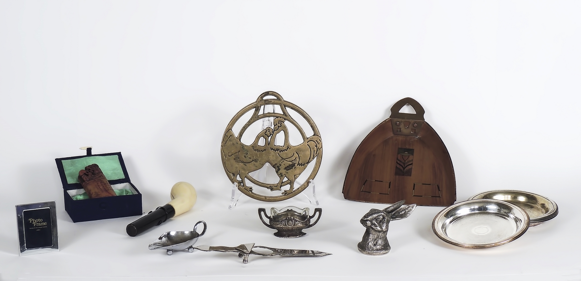 LOTTO DI CURIOSITÀ tra cui un pomo in avorio, un sigillo orientale in pietra saponaria e alcuni legatovaglioli con iniziali in ottone