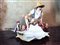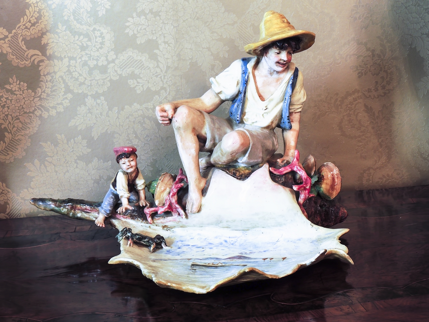 GRANDE GRUPPO IN TERRACOTTA POLICROMA Napoli, seconda metà del XIX secolo raffigurante pescatorelli seduti su base realizzata come una grande conchiglia e dipinta con veduta del Golfo di Napoli, lieve difetto h cm 37x55x35