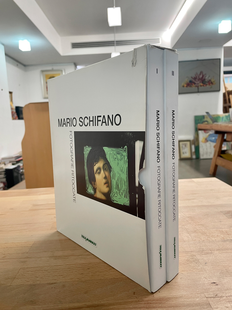 Cofanetto contenente due cataloghi riccamente illustrati inerenti le celebri fotografie ritoccate a pennarelli e smalti di Mario Schifano