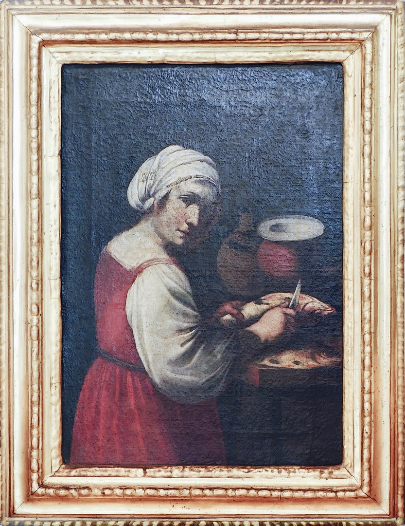 LA PESCIVENDOLA Scuola fiamminga del XVIII secolo olio su tela in cornice in oro zecchino cm 42x30,5