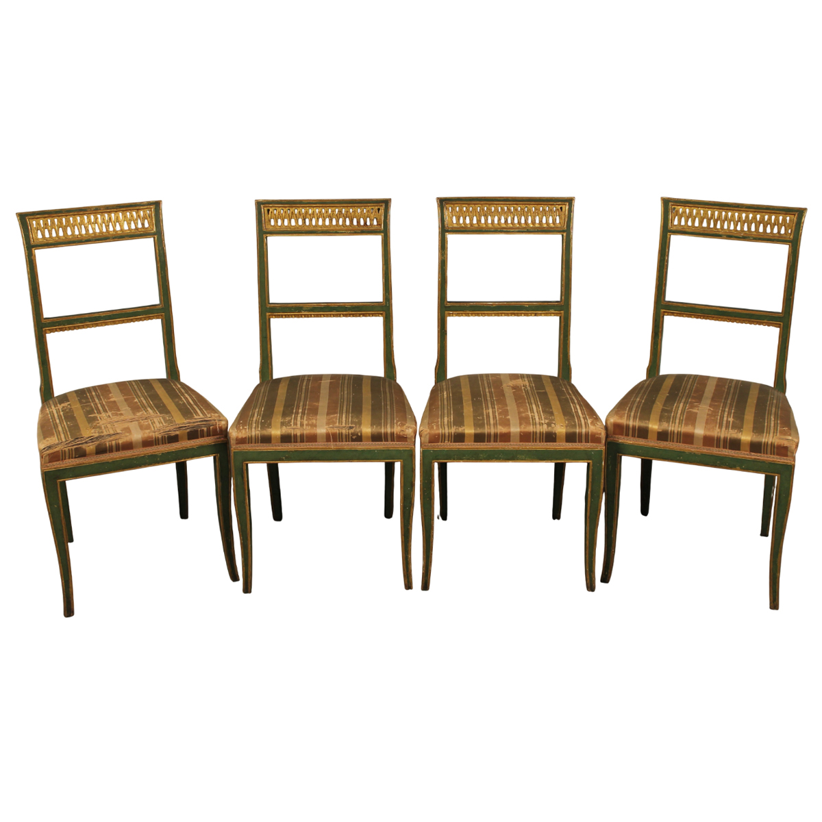 Otto sedie Legno dipinto con decoro ornamentale dorato su fondo verde....