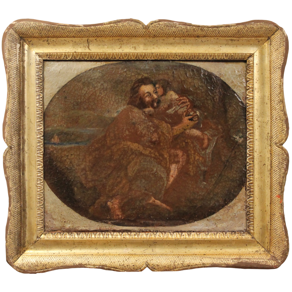 Scuola siciliana del secolo XVIII "Paternità" Dipinto ad olio su tela in cornice in legno dorato a vassoio. Cm 39x49