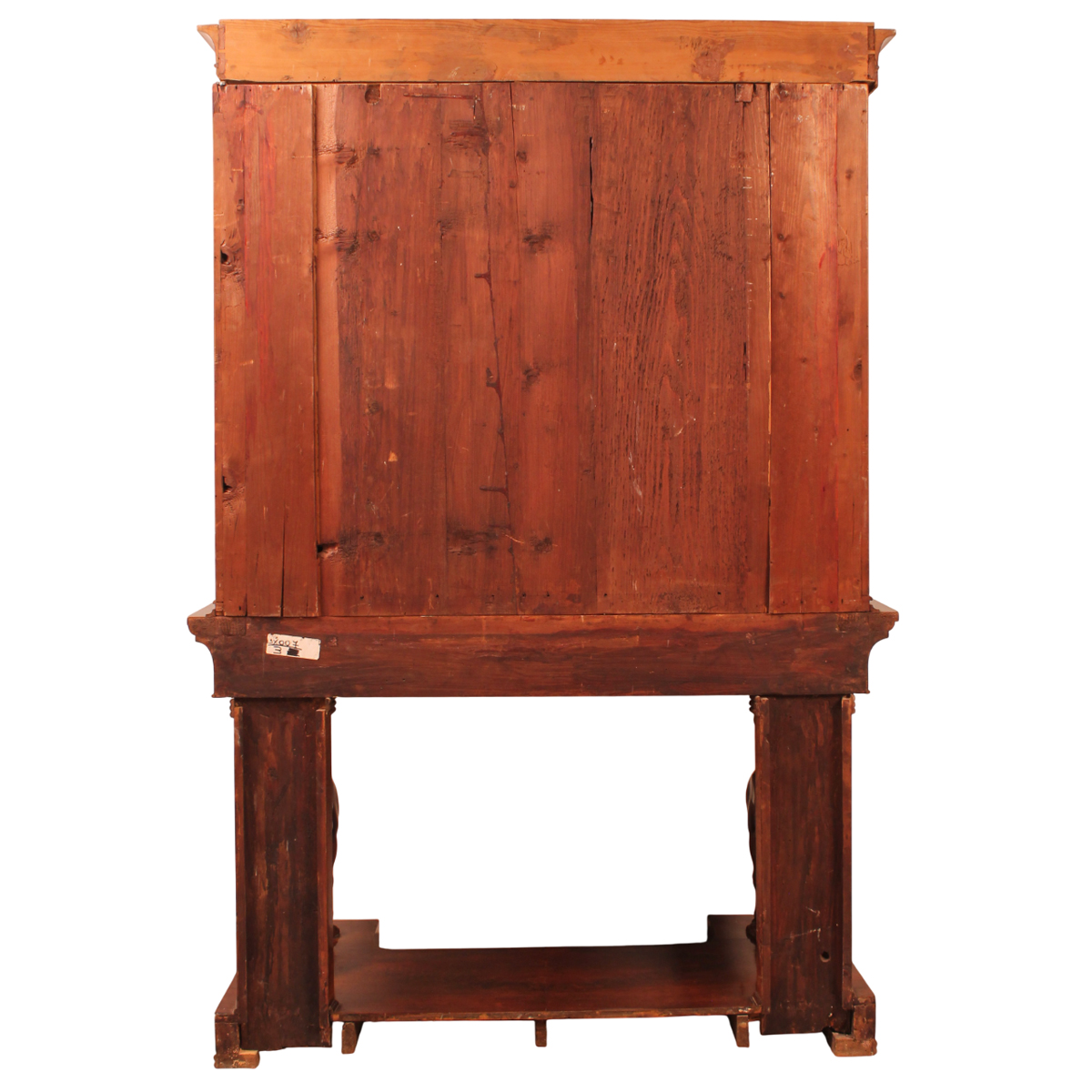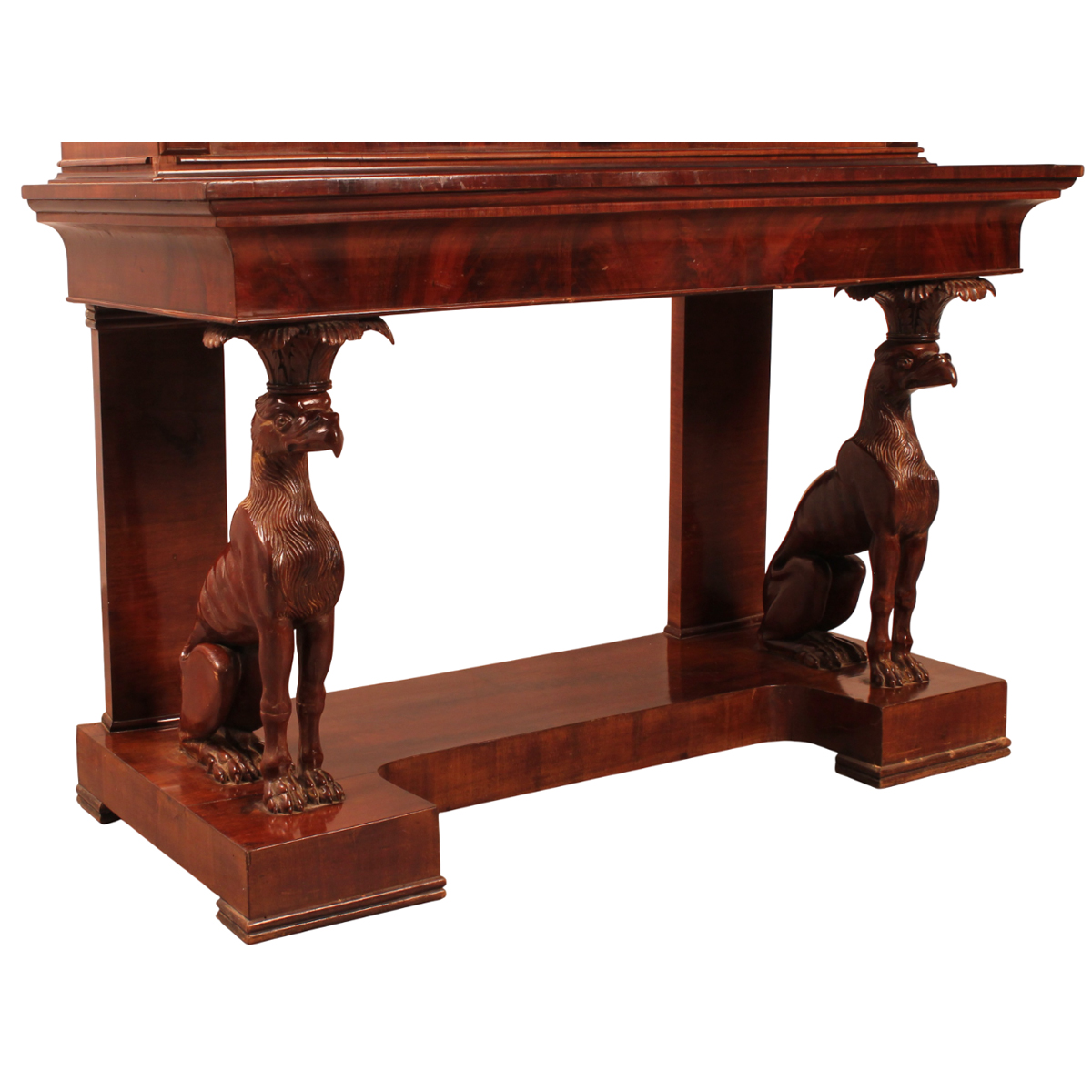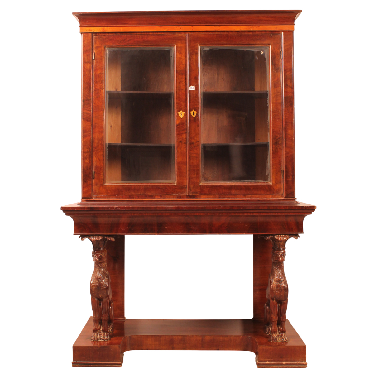 Vetrina a doppio corpo Piuma di mogano con grifoni scolpiti nella parte inferiore. Sicilia. Epoca impero. Cm 133,5x58 h 196