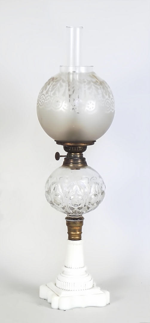 LAMPADA AD OLIO IN VETRO LATTIMO base sagomata, bobeche in vetro, montata a...