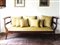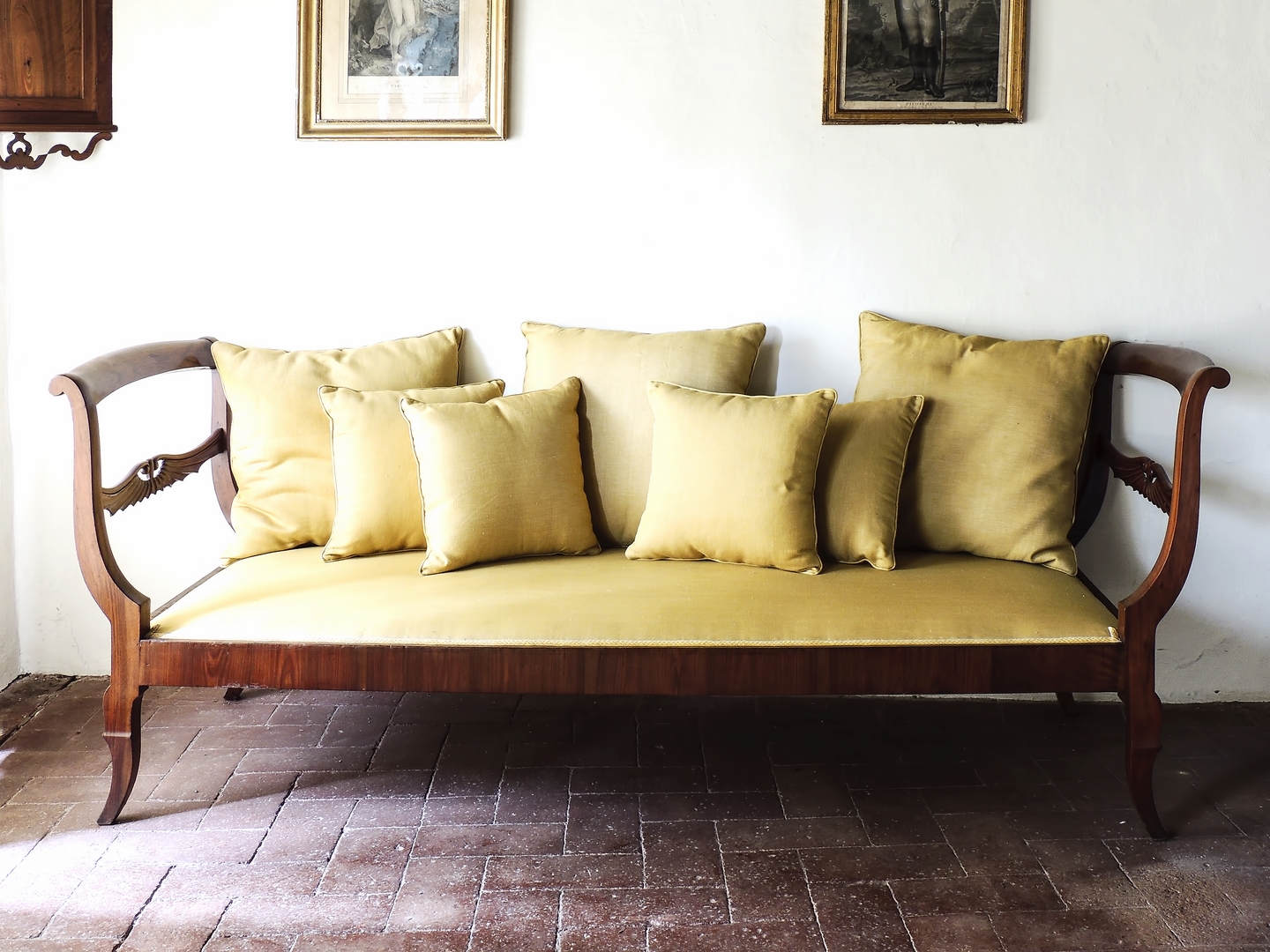 DIVANO A PANCA IN NOCE prima metà del XIX secolo alti braccioli a giorno rovesciati con cartella a pipistrello, gambe leggermente mosse, seduta imbottita e rivestita in tessuto giallo, corredato da numerosi cuscini lungh cm 227