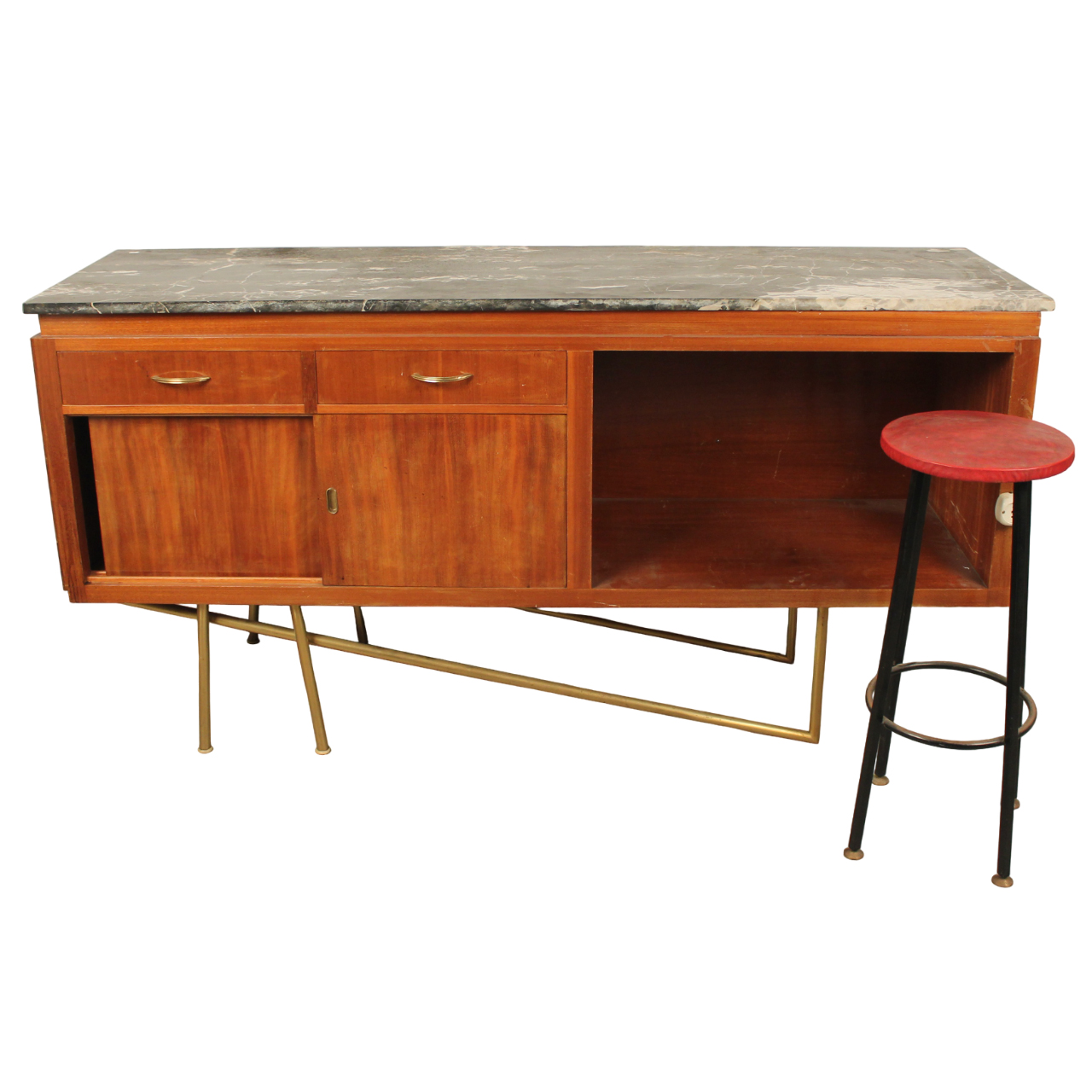 Grande mobile bar Legno scannellato con applicazioni in vetro e legno dipinto a motivi ornamentali. Piedi in ottone, piano in marmo venato e due sgabelli. Metà secolo XX. Cm 180x54 h 92