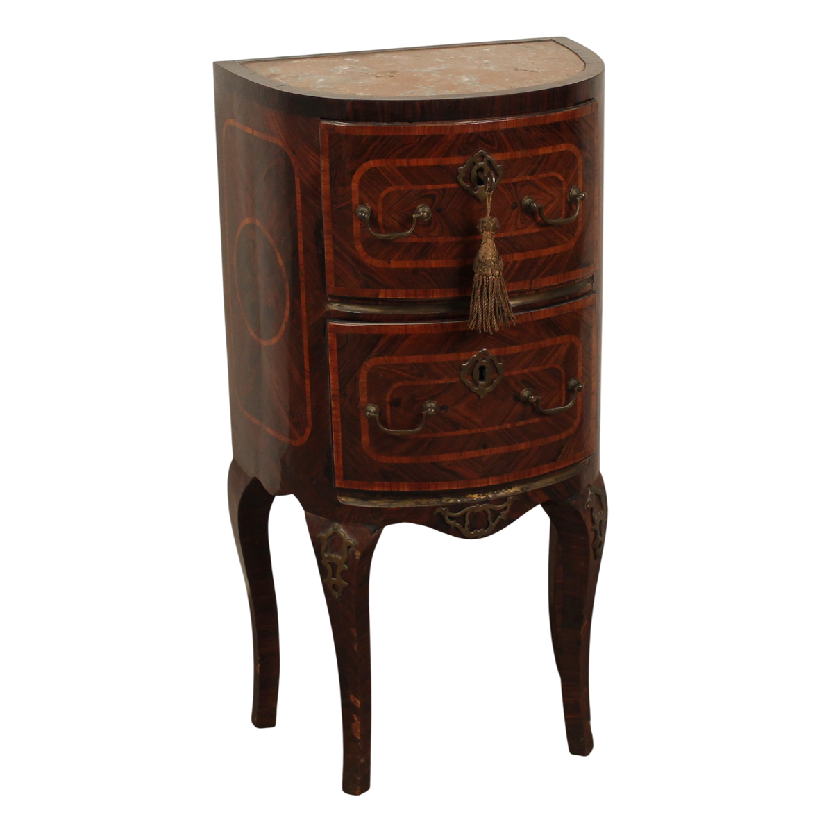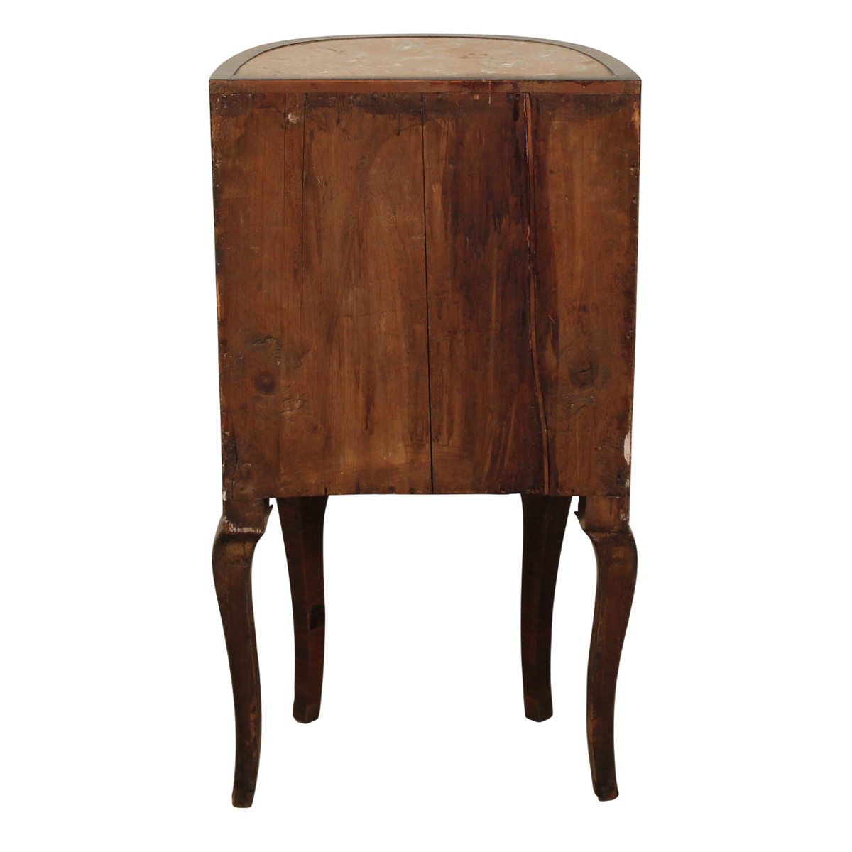 Comodino a mezzo arancio Ebano violetto con perfili in legno rosa e maniglie in bronzo dorato. Piano incassato in marmo venato. Sicilia. Secolo XIX. Cm 42x33 h 81