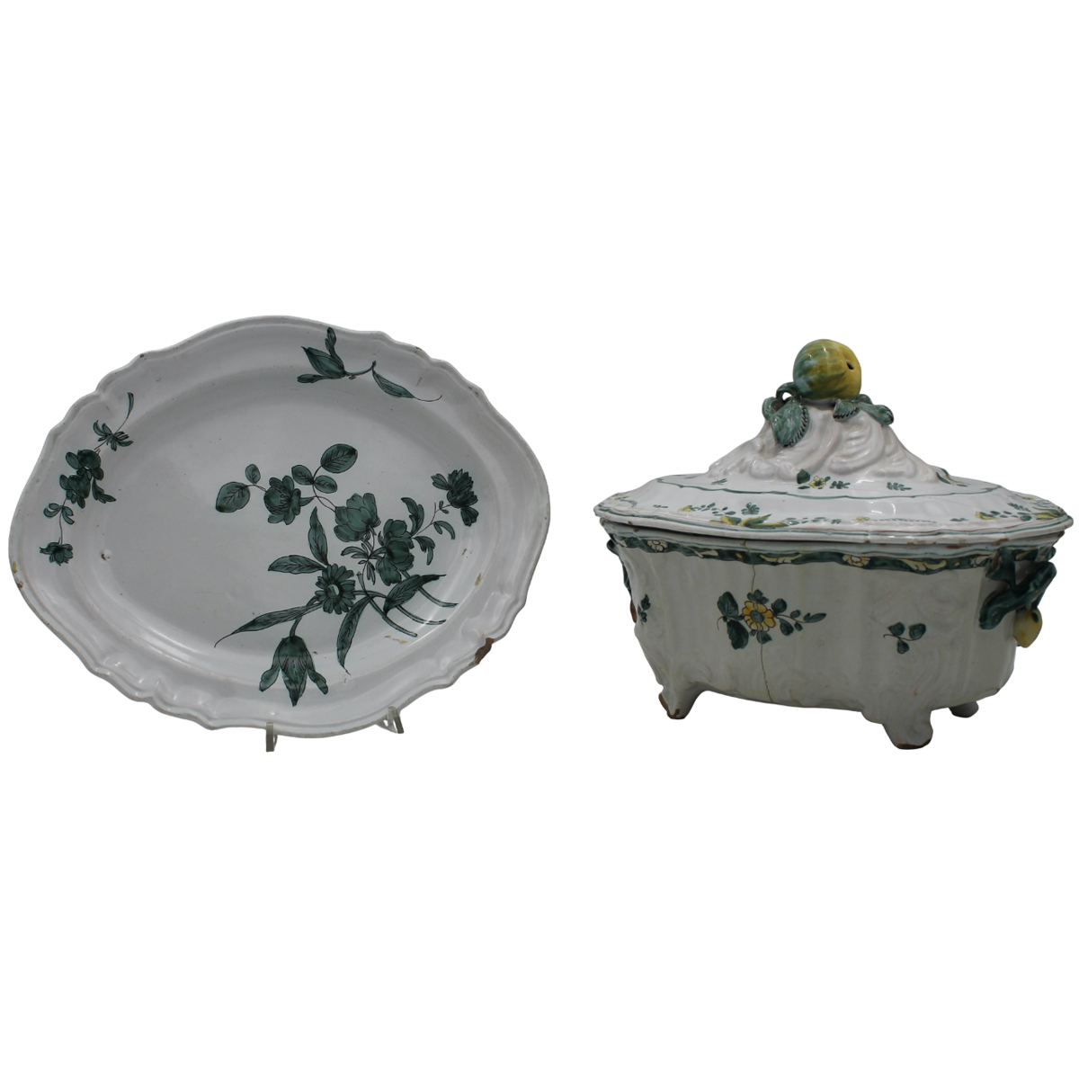 Zuppiera con vassoio Antica maiolica decorata a motivi vegetali e floreali...