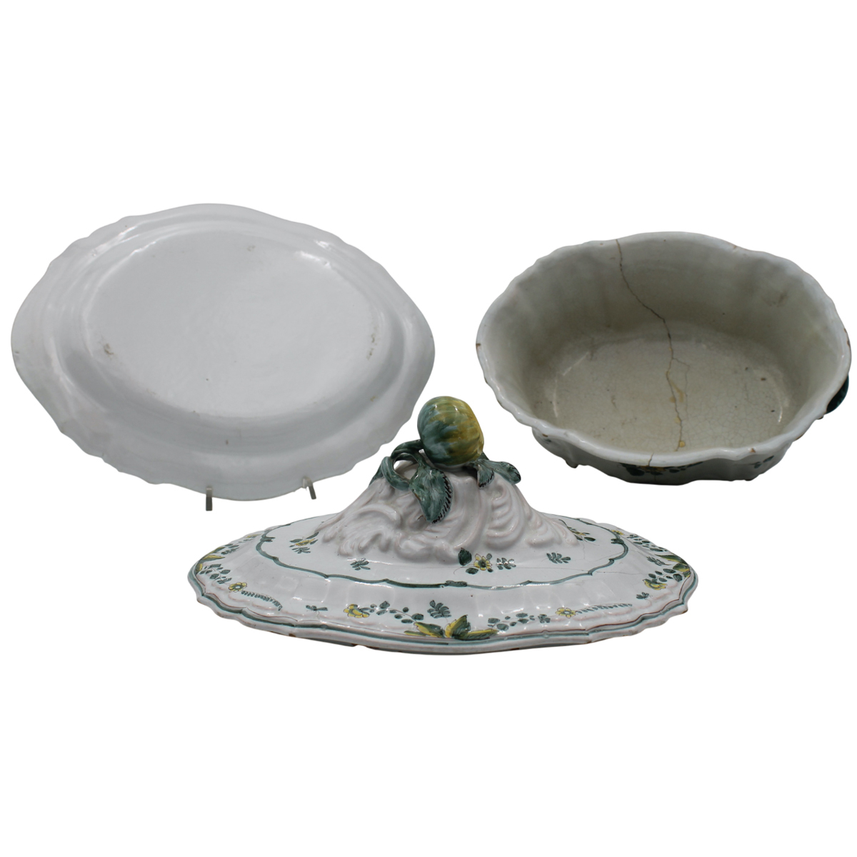 Zuppiera con vassoio Antica maiolica decorata a motivi vegetali e floreali policromi (rotture e incollaggi). Cerreto. Secolo XIX. Cm 33x24 h 24 (zuppiera)