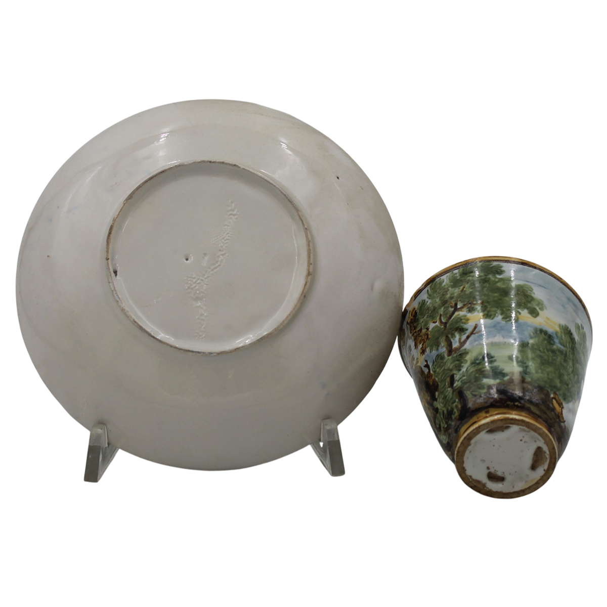 Tazzina e piatto Antica maiolica decorata con scena campestre. Napoli. Fine...