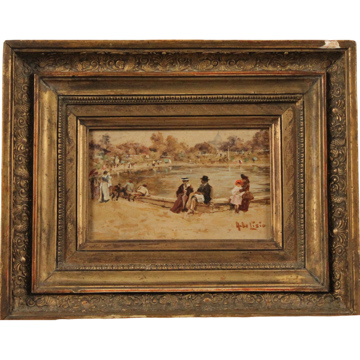 Arnaldo De Lisio (1869/1949) "La visita al parco" Dipinto ad olio su tavola in cornice in legno dorato. Cm 10x16