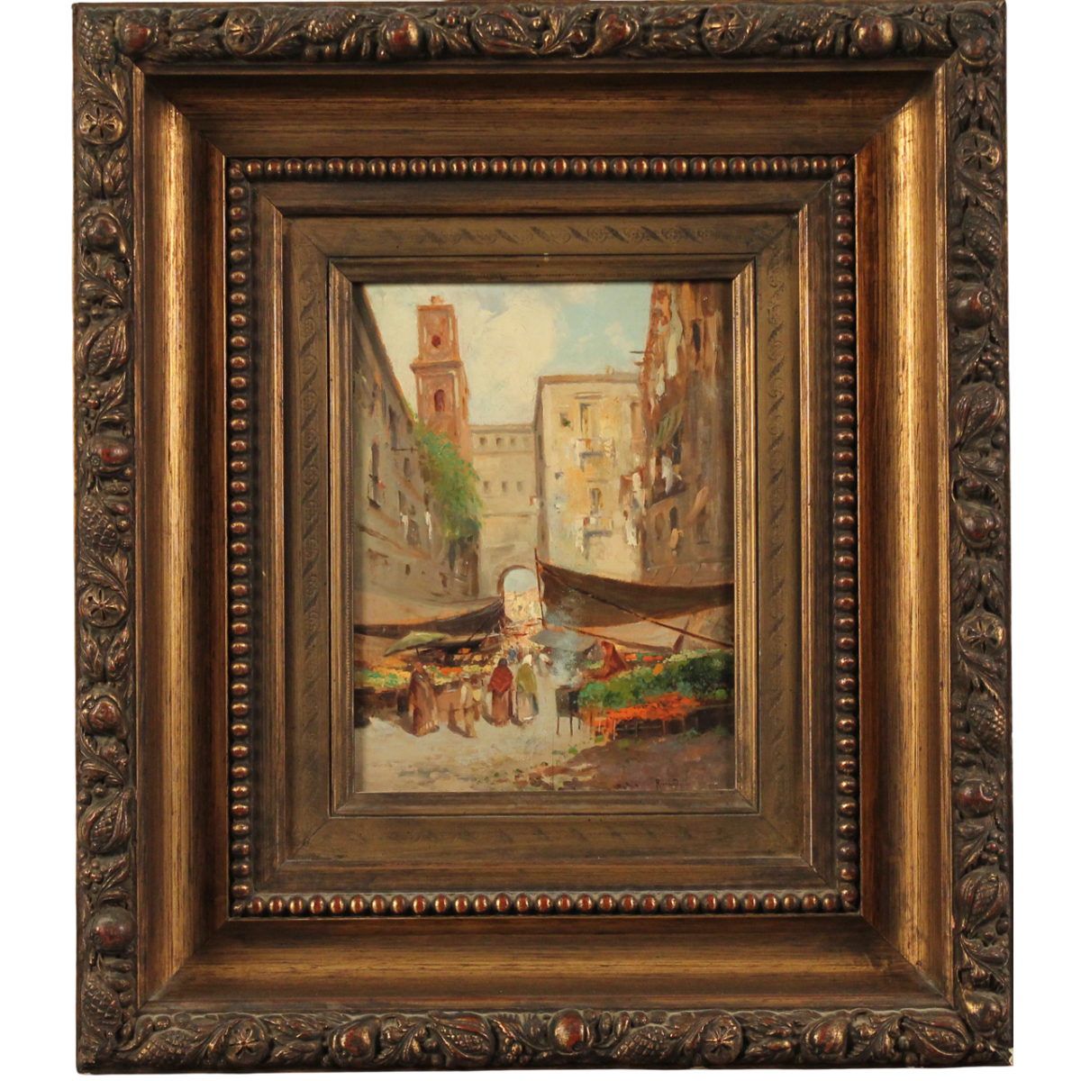 Oscar Ricciardi (1864/1935) "Scena di mercato" Dipinto ad olio su tavola in cornice in legno dorato. Cm 24x18