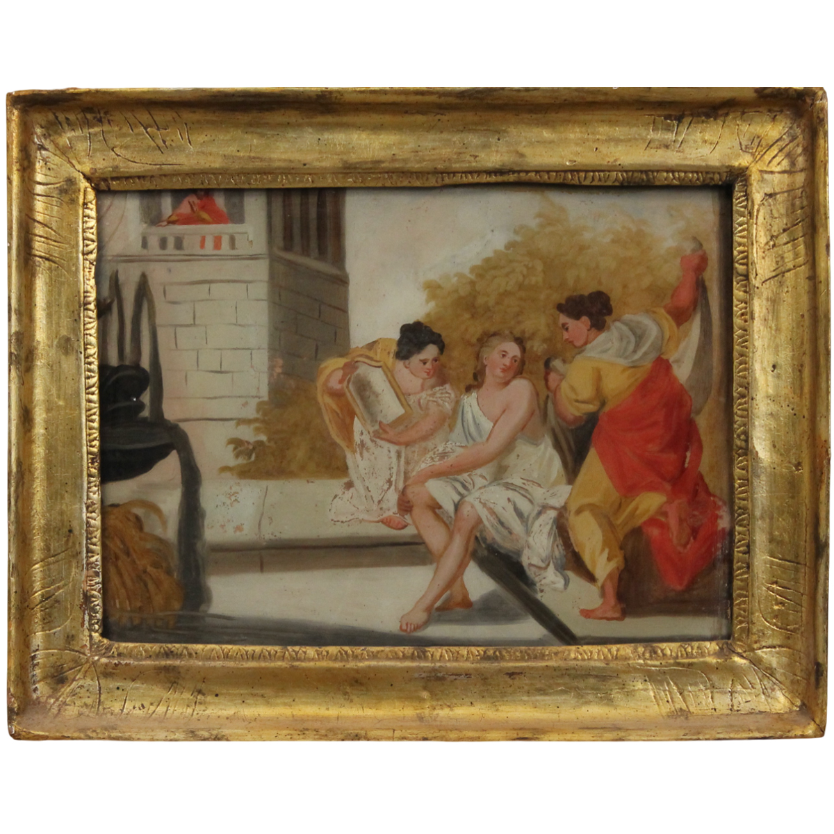 Scuola siciliana degli inizi del secolo XIX "Scena classica" Dipinto ad olio su vetro in cornice in legno dorato (rottura nell'angolo sinistro superiore e restauri alla doratura della cornice). Cm 33x43