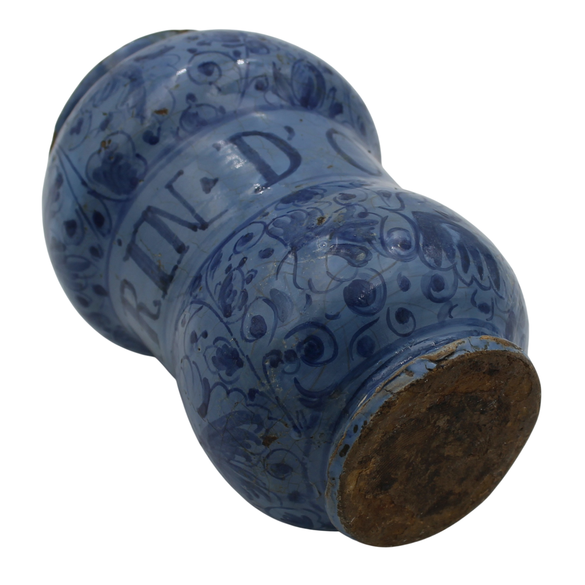 Vaso Antica maiolica decorata a berrettino con motivi floreali e iscrizione centrale. Marche. Secolo XVIII. Cm h 22,5