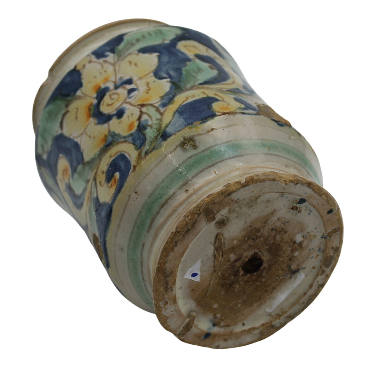 Rocchetto Antica maiolica decorata con volto di donna e motivi vegetali e floreali policromi (failure sul collo). Caltagirone. Secolo XVIII. Cm h 18
