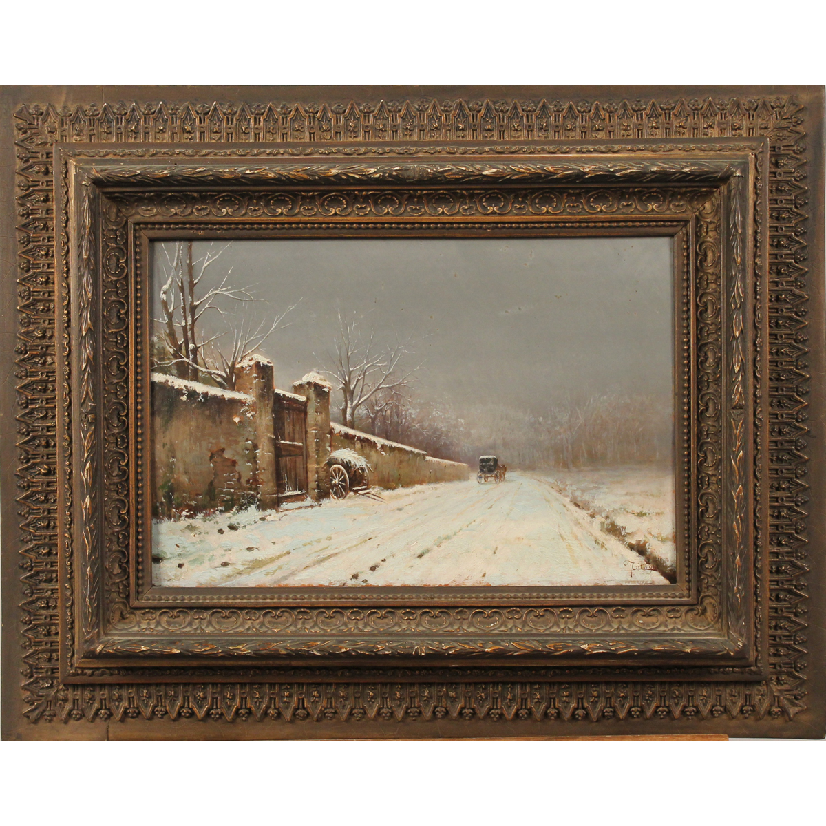 Paesaggio innevato Dipinto ad olio su tavola in cornice in legno dorato....