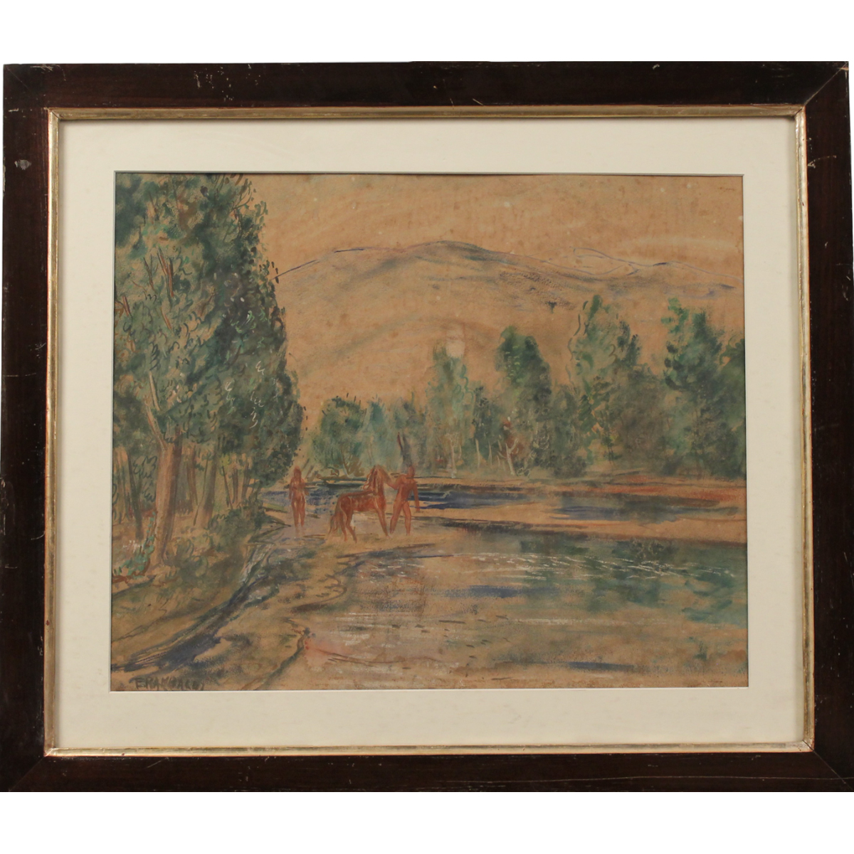 Emanuele Rambaldi (1903/1968) "Paesaggio con figure" Acquerello su carta in cornice di mogano. Cm 51x40