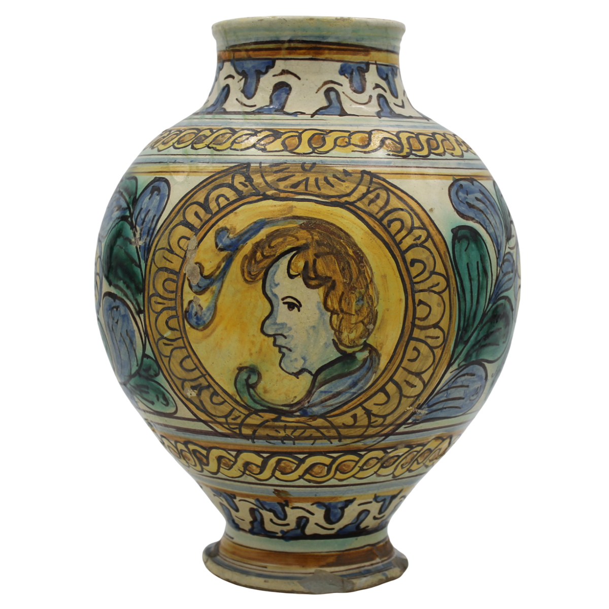 Grande vaso ovoidale Antica maiolica policroma decorata sul davanti co medaglione centrale raffigurante profilo di ragazzo. Decoro a motivi ornamentali e floreali policromi sul retro (lievi mancanze alla base). Burgio. Secolo XVIII. Cm h 35