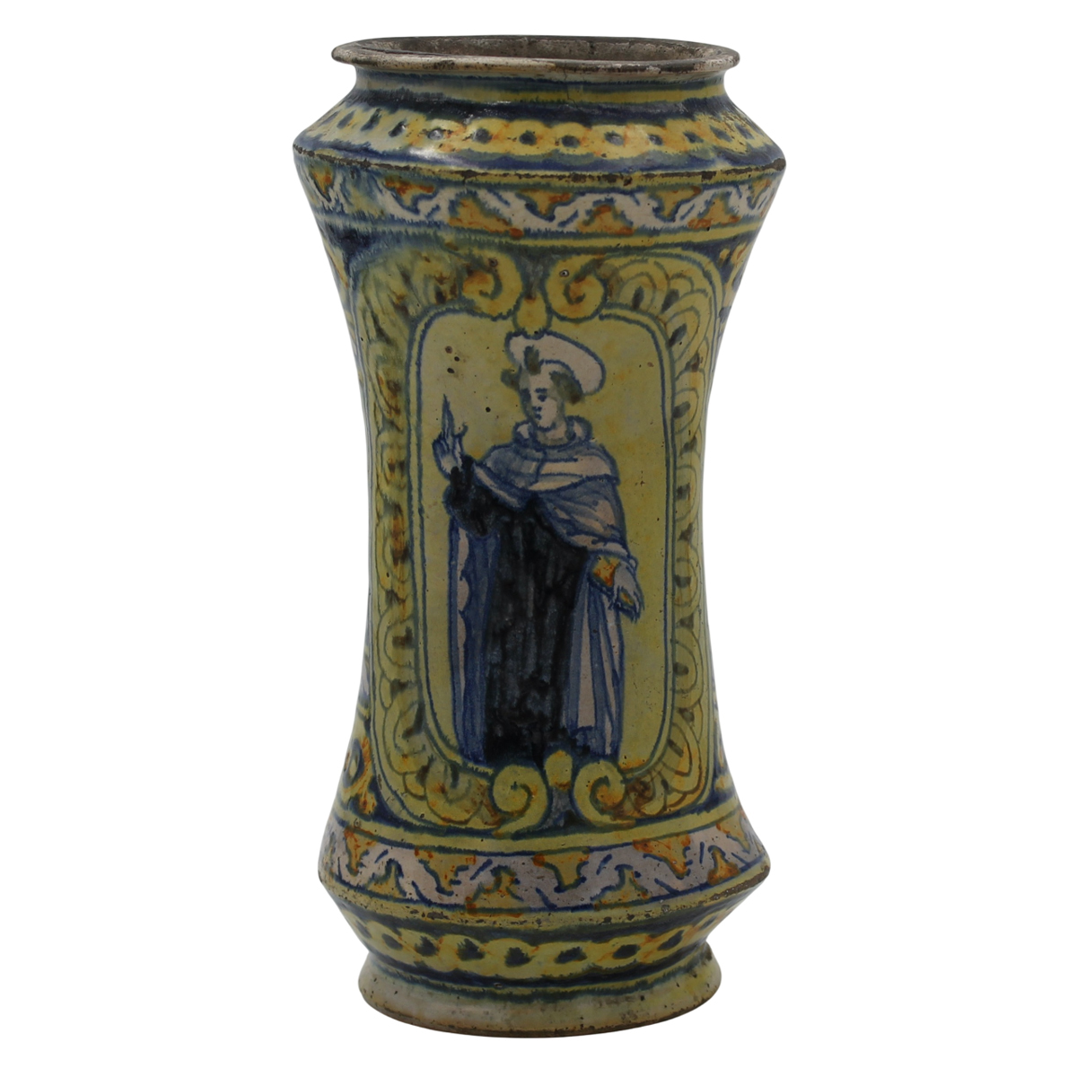 Albarello Antica maiolica con medaglione centrale raffigurante Santo e motivi...