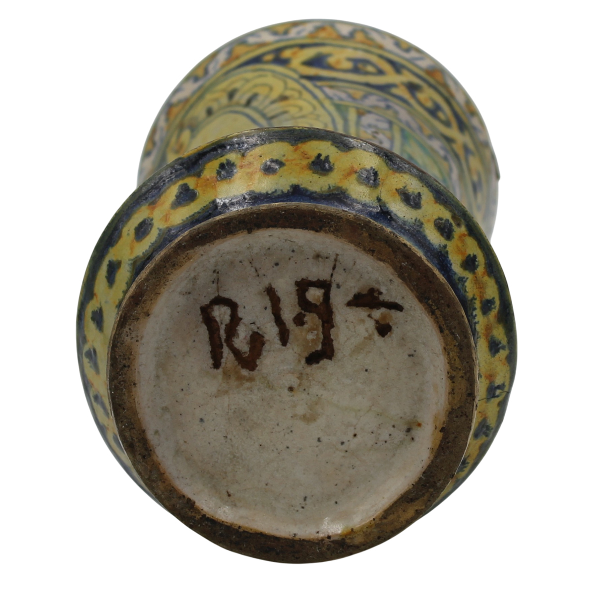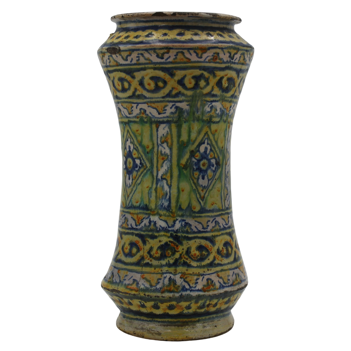 Albarello Antica maiolica con medaglione centrale raffigurante Santo e motivi geometrici e vegetali policromi sul retro (lievi difetti di cottura e failure alla base). Palermo. Secolo XVII. CM h 30