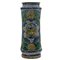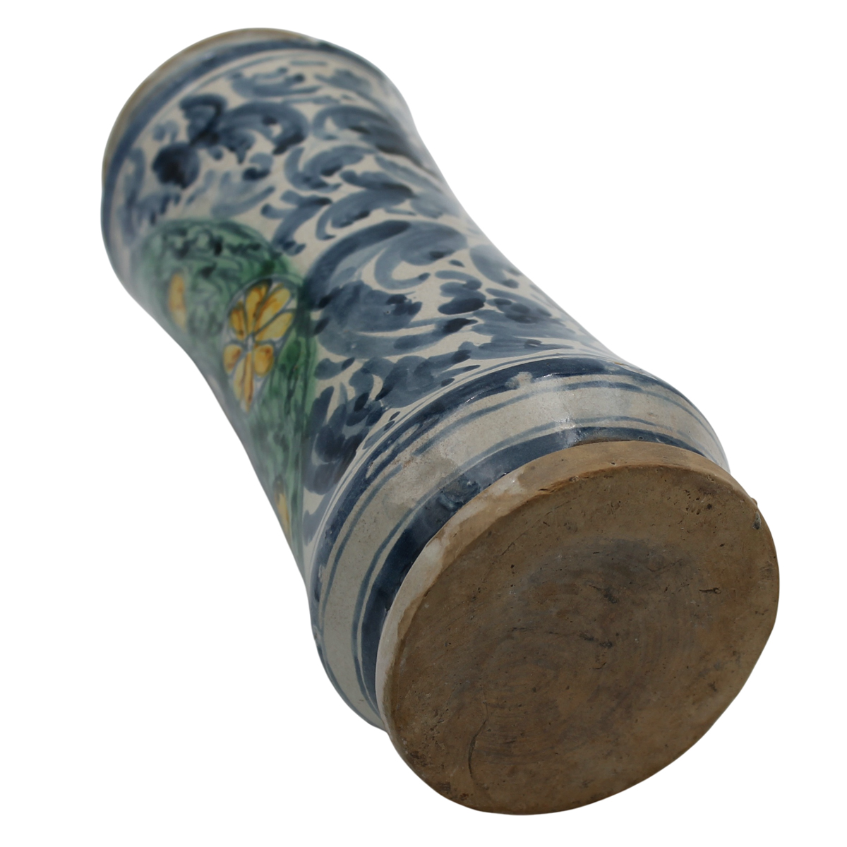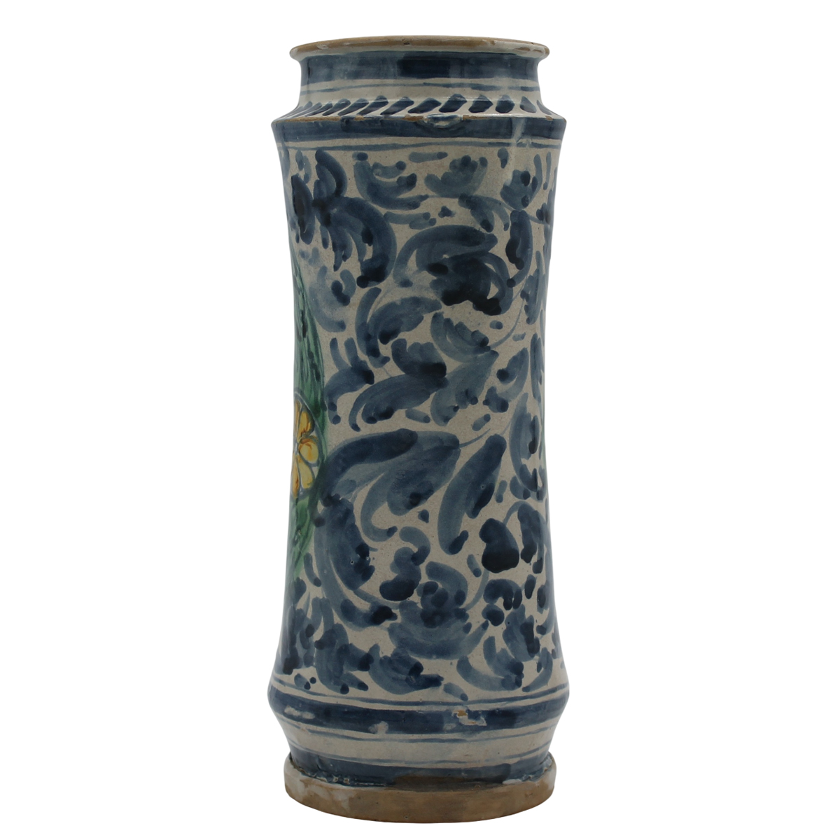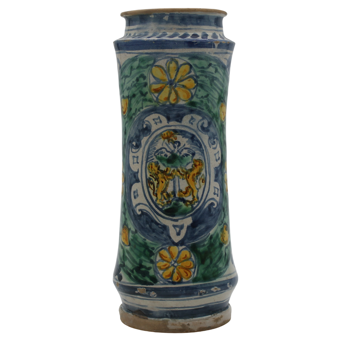 Albarello Antica maiolica decorata sul davanti con stemma gentilizio contornato da motivi floreali e vegetali policromi, sul retro motivi ornamentali in azzurro. Trapani. Fine secolo XVI. Cm h 27,5