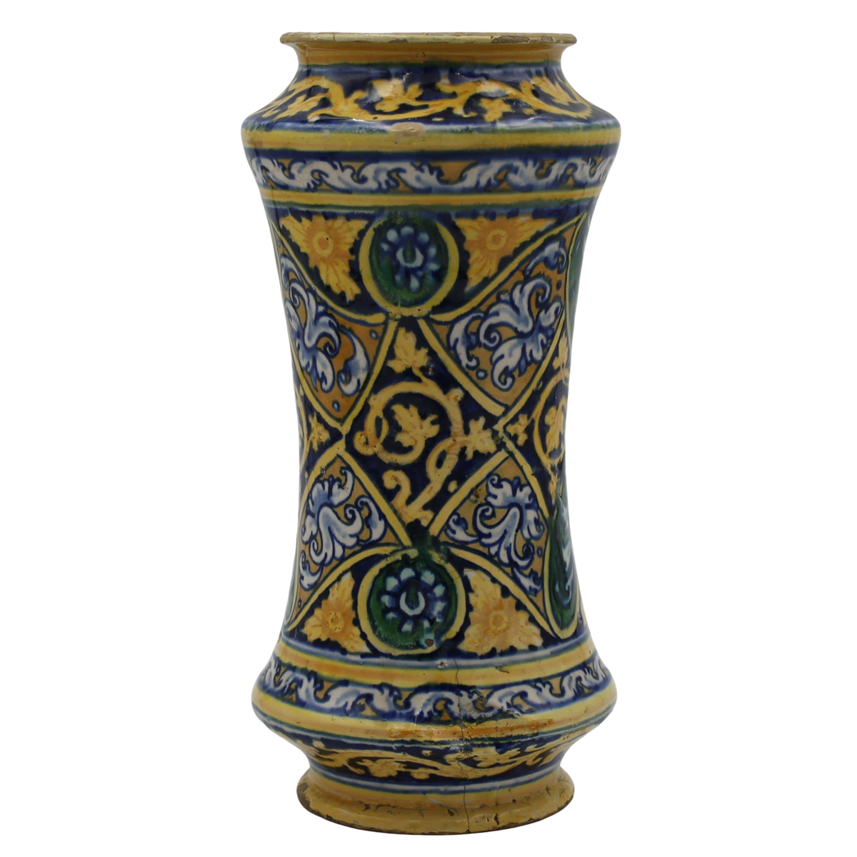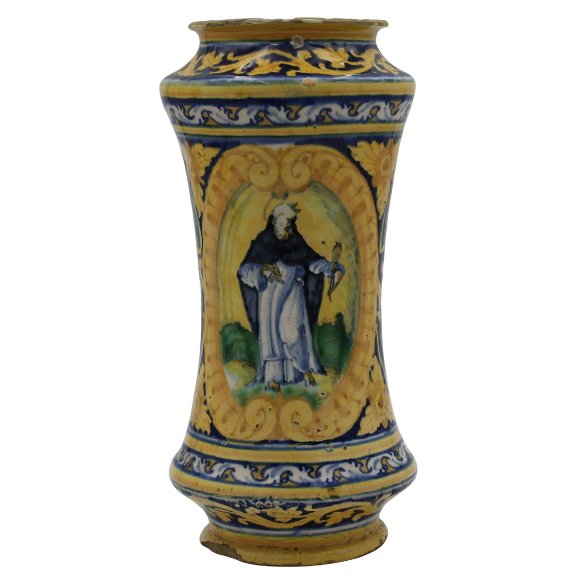 Albarello Antica maiolica con medaglione centrale raffigurante Santo sul...
