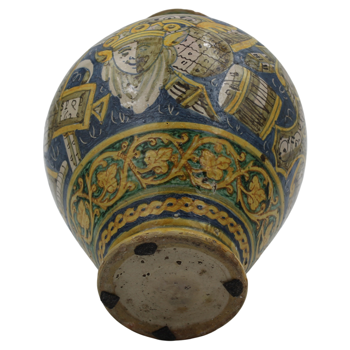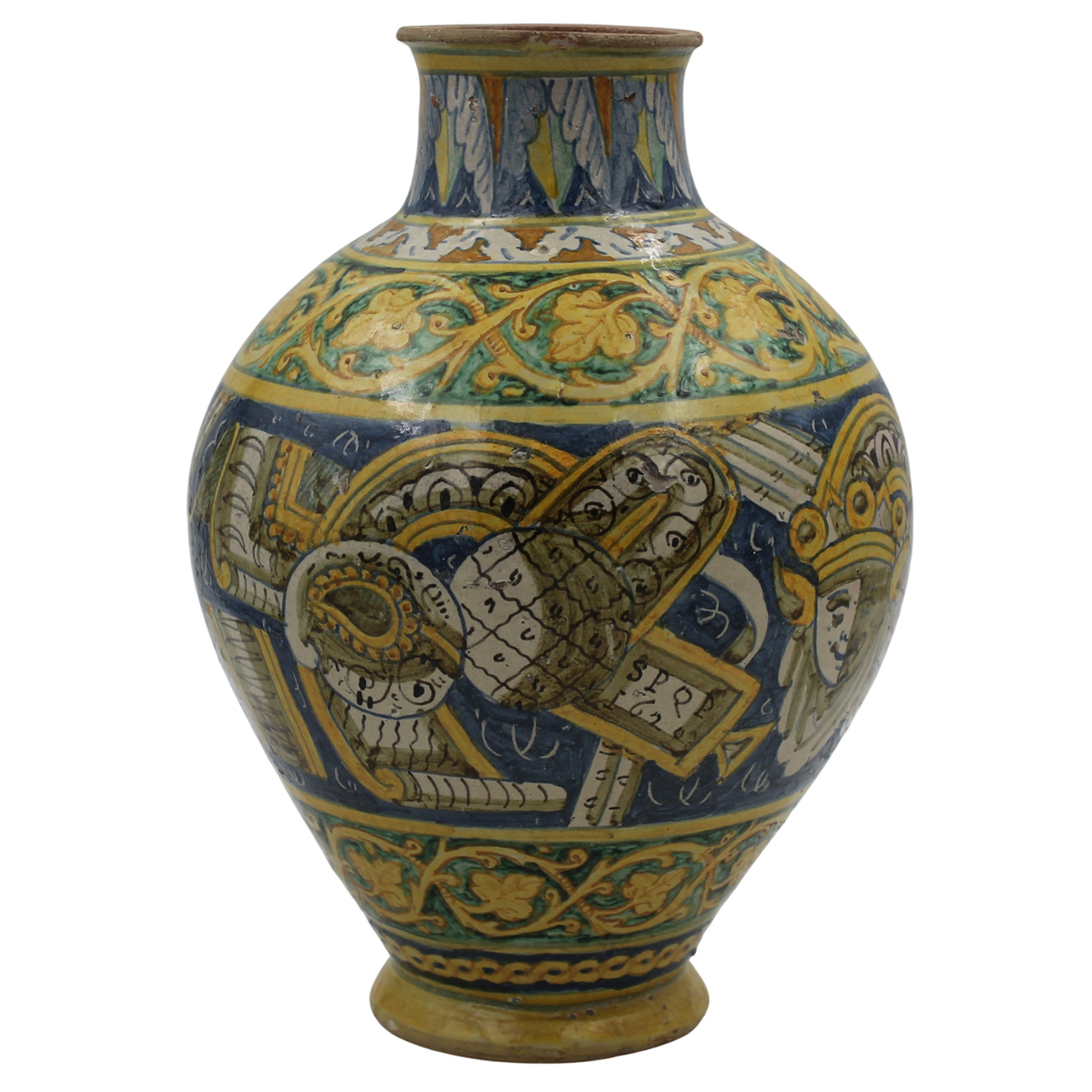 Importante vaso ovoidale Antica maiolica con medaglione centrale raffigurante Santo e ricco decoro con trofei, mascheroni e motivi ornamentali policromi sul retro. Palermo. Datata S.P.Q.P. 1624. Cm h 36