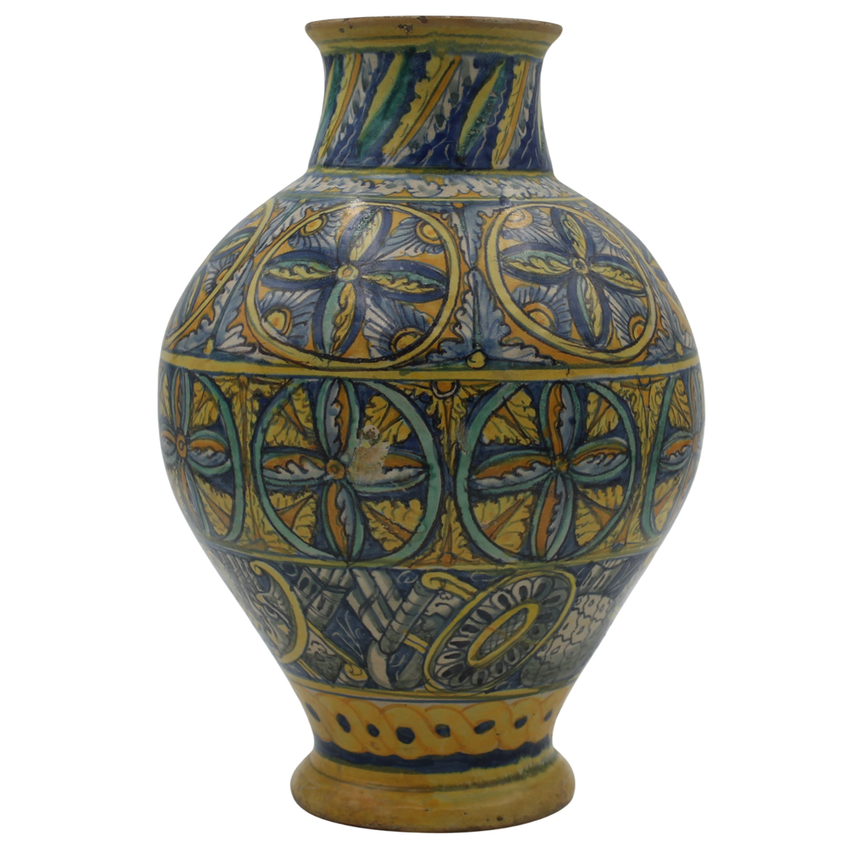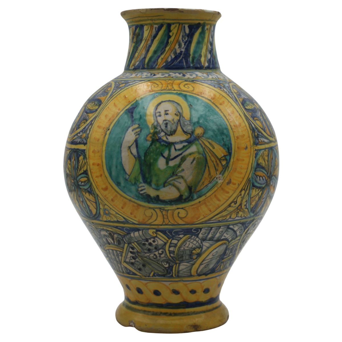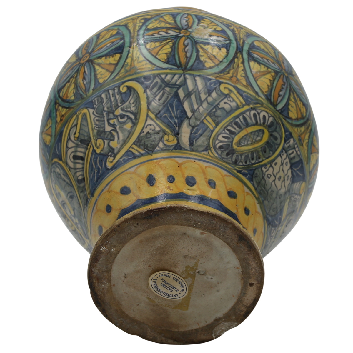 Grande vaso ovoidale Antica maiolica con medaglione centrale raffigurante il Cristo e ricco decoro a tutto tondo a motivi geometrici e vegetali policromi. Palermo. Secolo XVII. Cm h 35,5