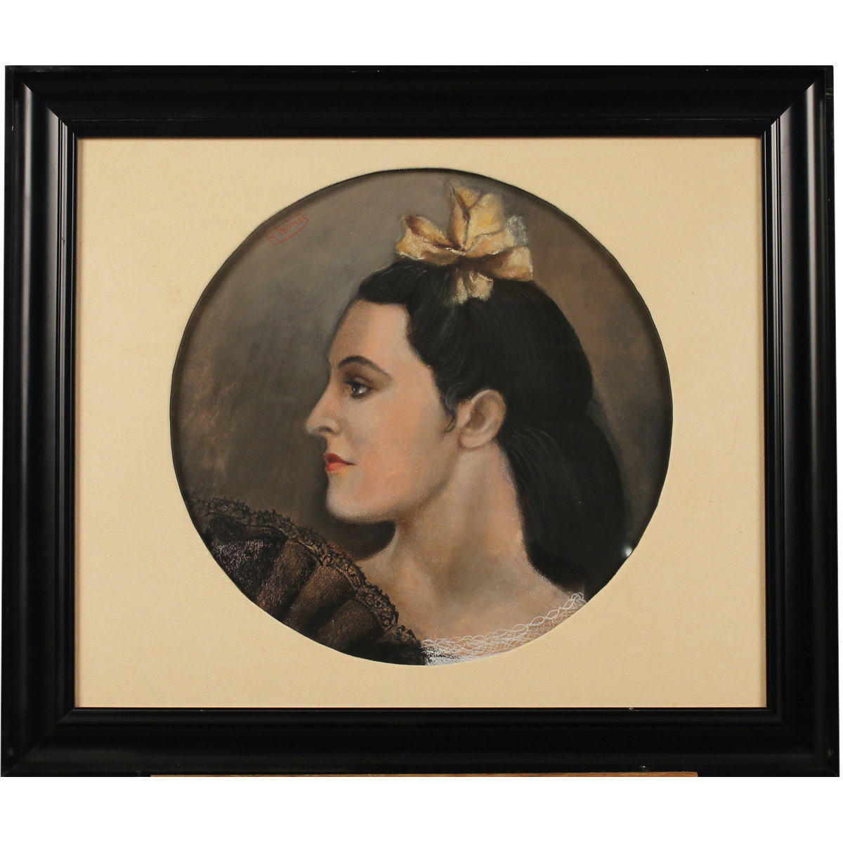 Profilo di dama Pastello circolare su carta. Firmato H. Thomas. Cm d 43