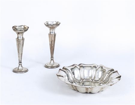 LOTTO DI ARGENTERIA composto da un cestino rotondo e da una coppia di vasetti per rosa, Birmingham, inizio del XX secolo, con basi appesantite gr netti 290 (3)