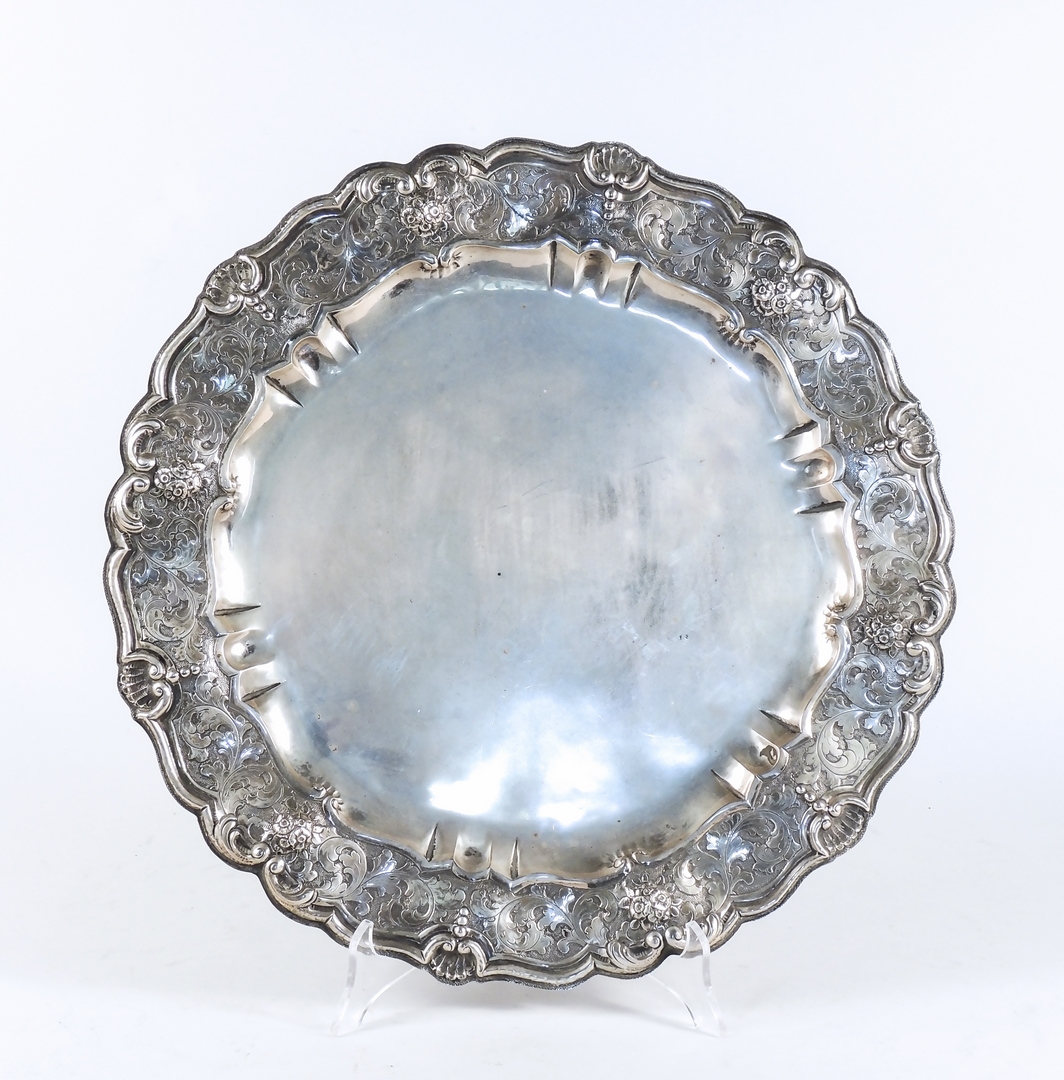 VASSOIO ROTONDO IN ARGENTO Milano, Anni Trenta bordo mosso, tesa cesellata con motivi vegetali e sbalzato con mazzetti di fiori e conchiglie gr 845