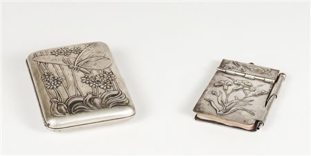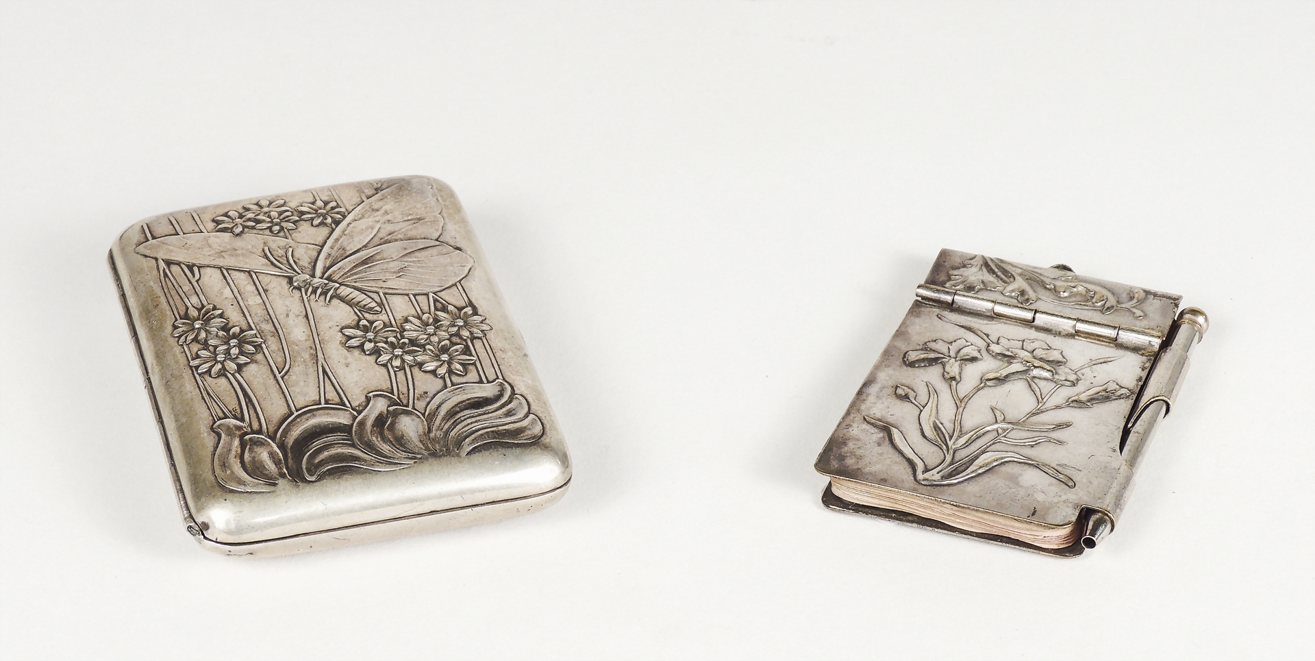 SCATOLA PORTASIGARETTE IN ARGENTO inizio del XX secolo sbalzata con motivo di fiori e farfalla di gusto liberty corredata da un taccuino da borsetta coevo in metallo argentato gr 55 (2)