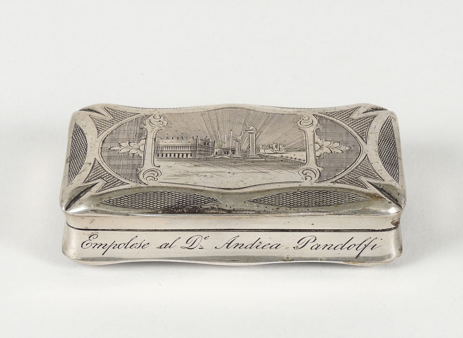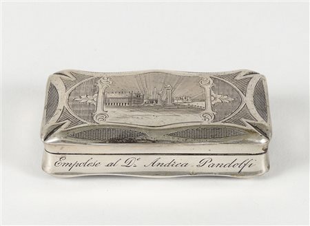 TABACCHIERA IN ARGENTO Francia, 1860 circa coperchio cesellato con veduta del Palazzo Ducale a Venezia, con dedica incisa datata 1863 gr 55