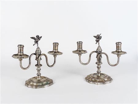 COPPIA DI CANDELABRI IN ARGENTO Firenze, Anni Trenta due bracci portacandele a doppia voluta, finale sormontato da putto che sorregge un delfino gr 890