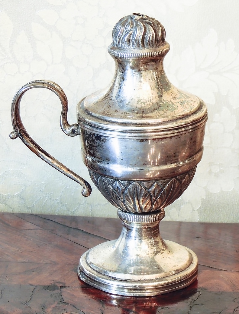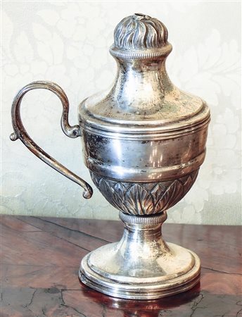 STOPPINIERA IN ARGENTO Firenze, Giovanni Guadagni, prima metà del XIX secolo finale a fiamma, corpo ad urna sbalzato con foglie di alloro, presa a voluta, lievi difetti gr 145