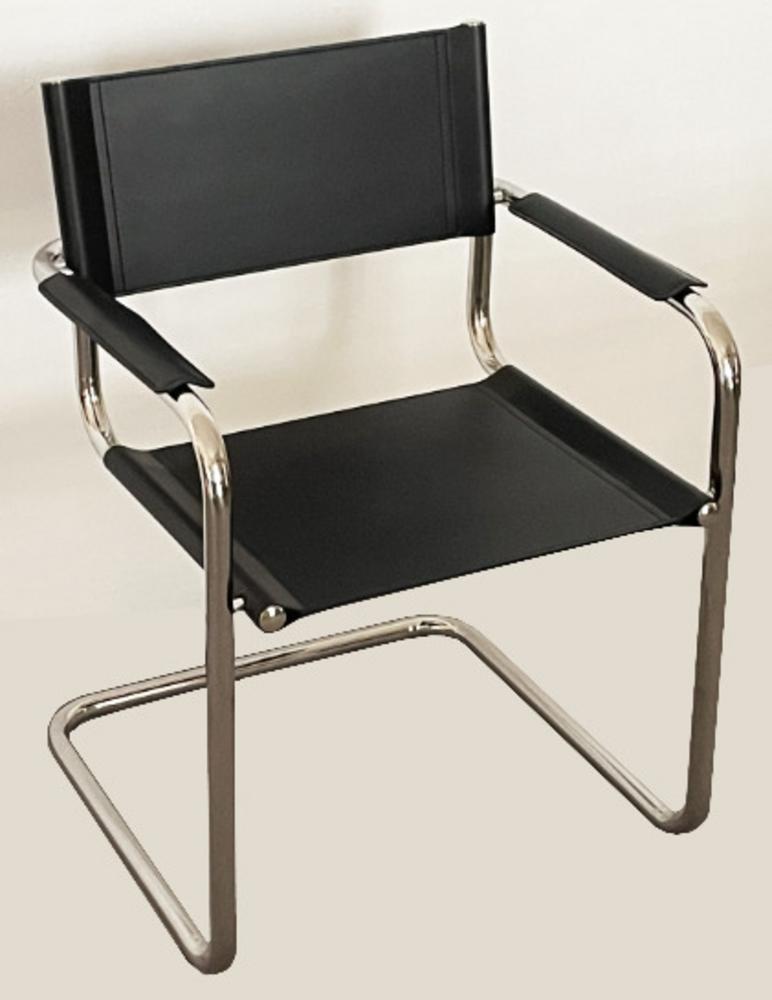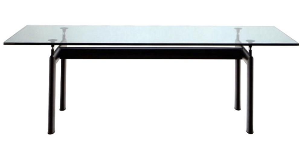 tavolo con ripiano in cristallo cm 105x265 con struttura in acciaio cromato nero h cm 73 e 8 sedie/poltrone ispirate a Cantilever Chairs di Mart Stam struttura in acciaio cromato e rivestimento in eco-cuoio, cm 79x47x52 (con braccioli)