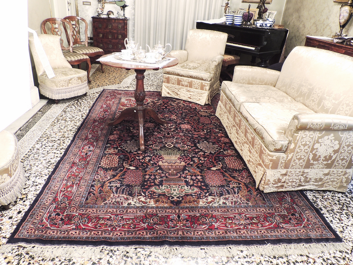 TAPPETO PERSIANO fondo blu, campo con motivi floreali e vegetali nei toni del...