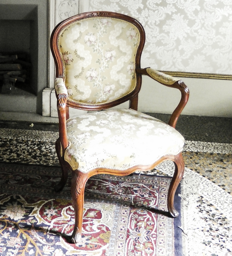 POLTRONCINA IN NOCE schienale sagomato, gambe mosse, imbottita e rivestita in tessuto fiorito nei toni del rosa e del giallo
