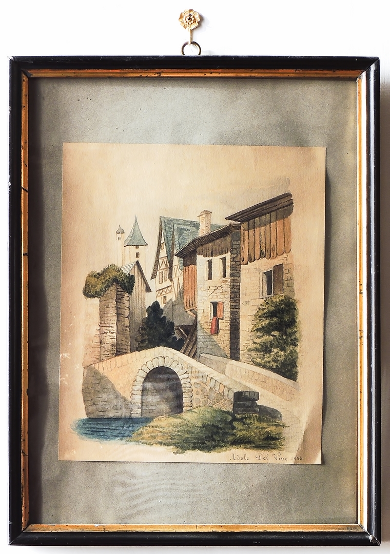 ADELE DEL VIVO Scorcio di paese acquerello su carta, firmato e datato 1886, in cornice cm 28x22,5