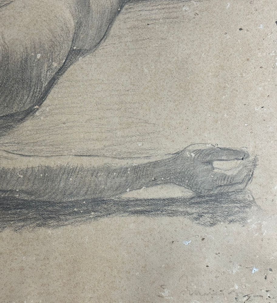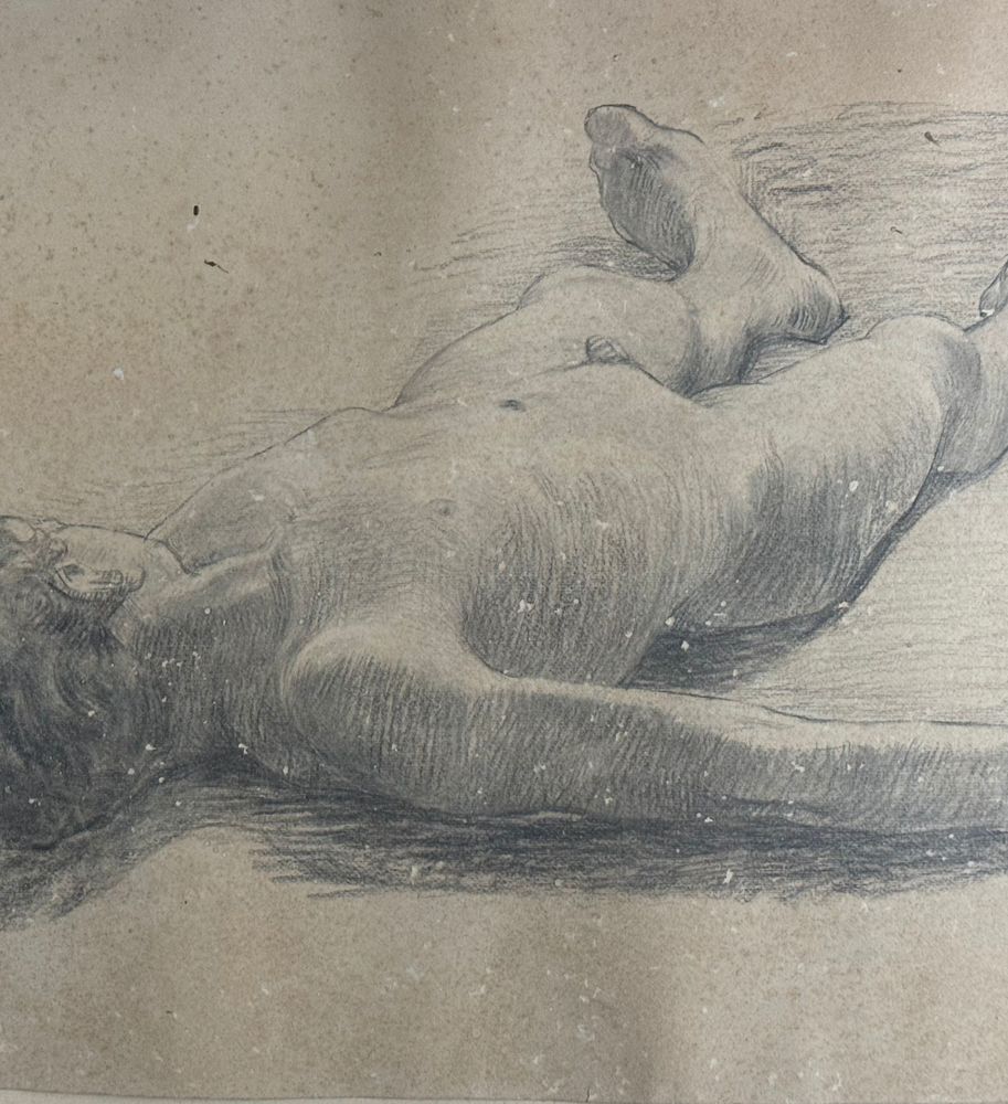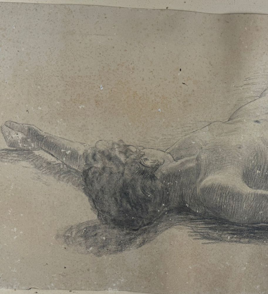 Disegno su carta, periodo XIX secolo scuola Italiana, raffigurante Bambino disteso. Dimensioni disegno: 47x87 cm. Reca firma in basso a destra da artista non identificato. Opera con lievi segni di vissuto.