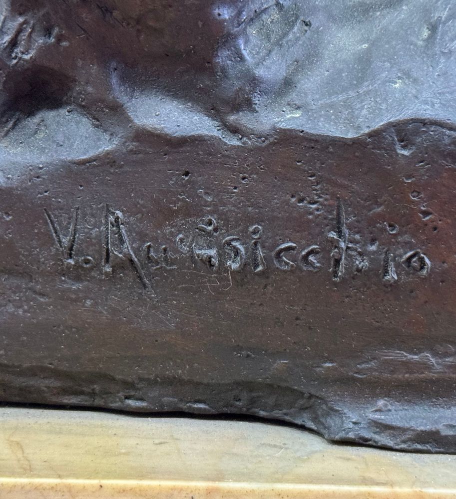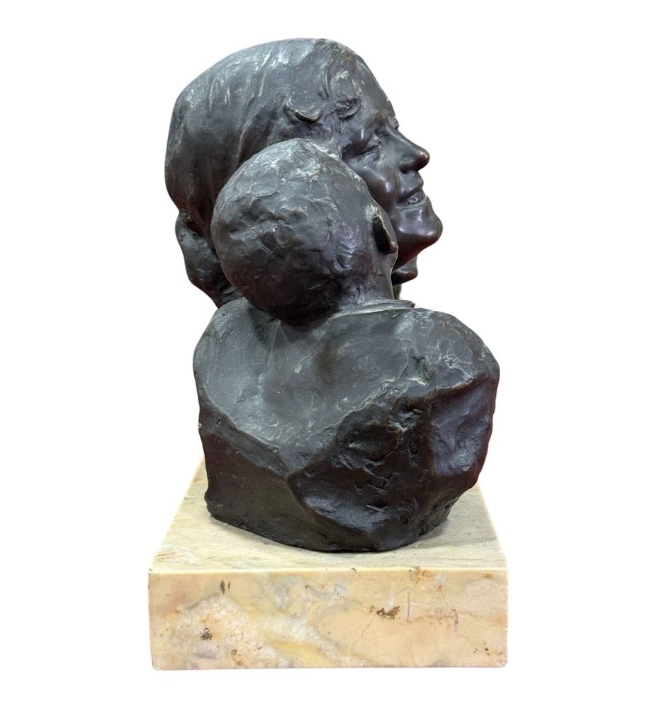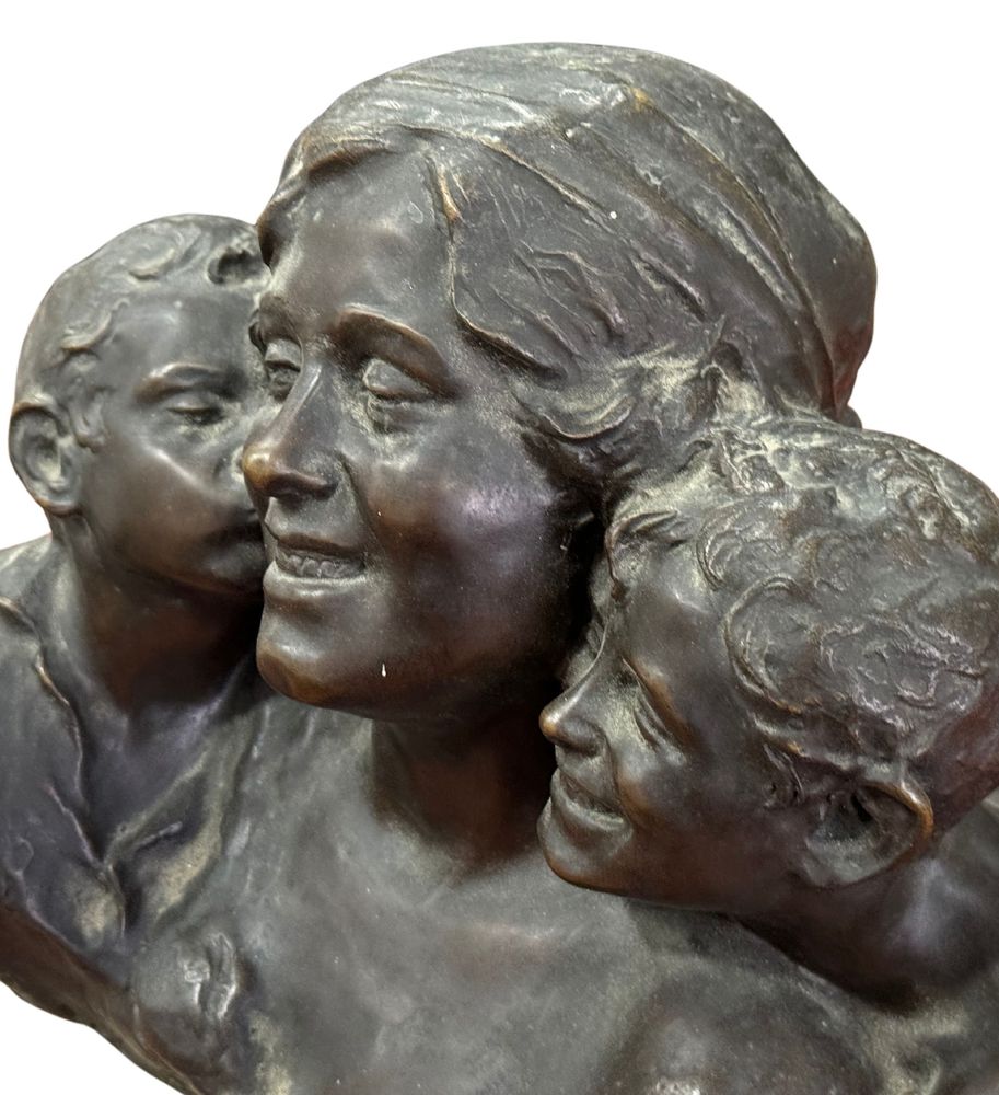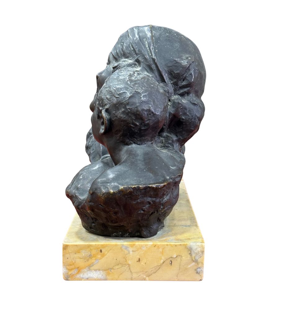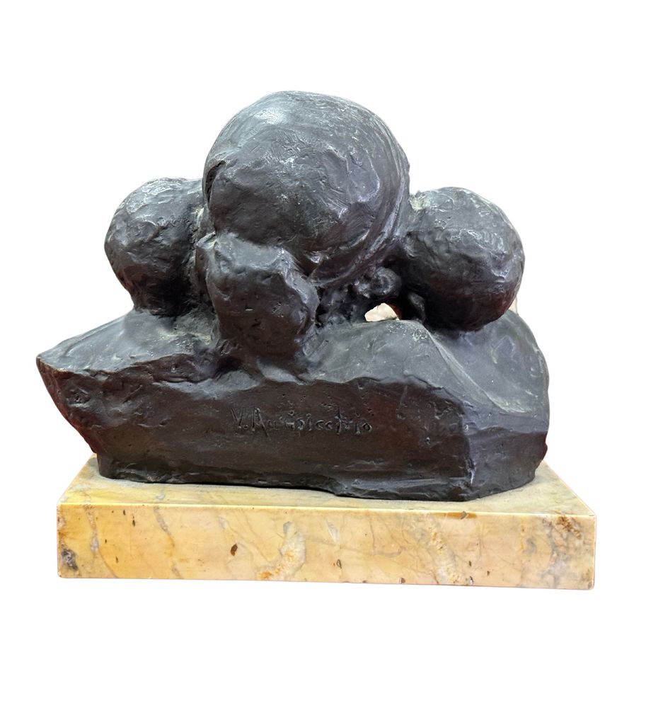 Scultura in bronzo a cera persa, periodo XX secolo, raffigurante Scena materna con tre personaggi. Dimensioni: h25x31x14 cm. In buone condizioni. Reca firma sul retro.