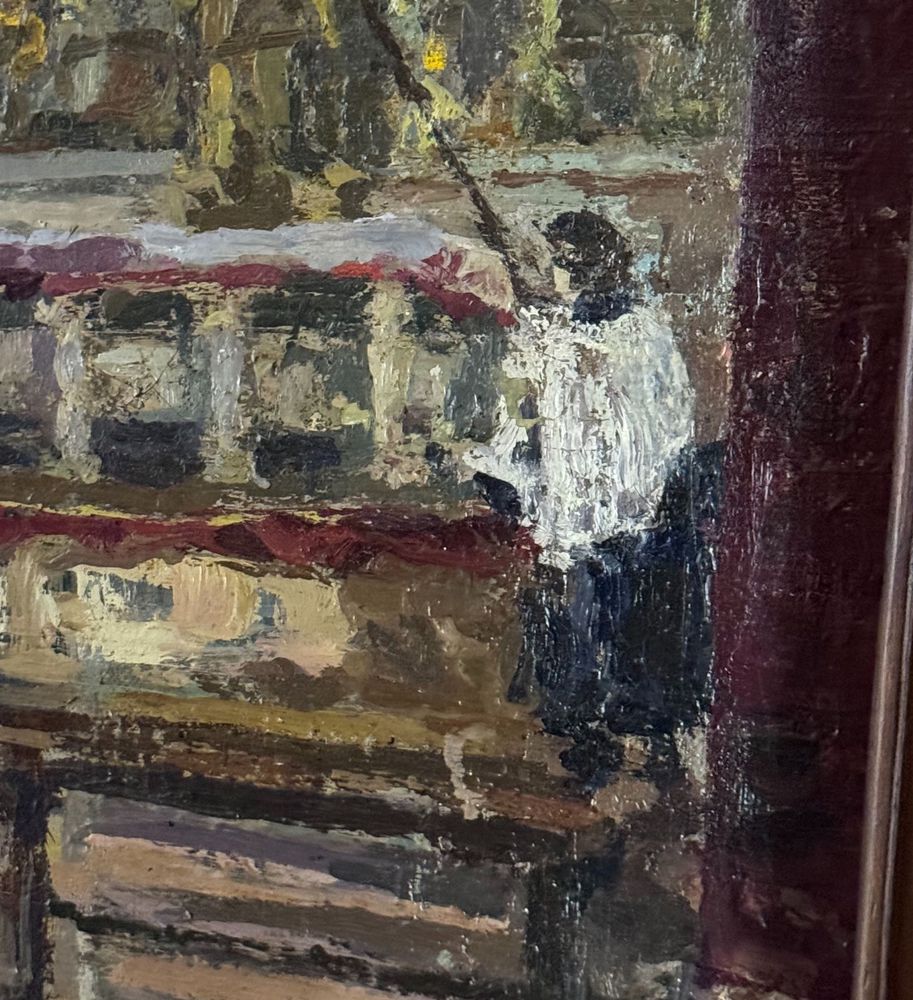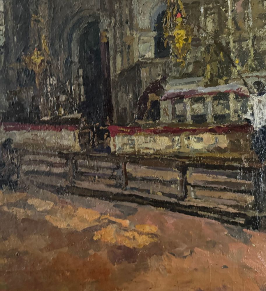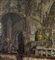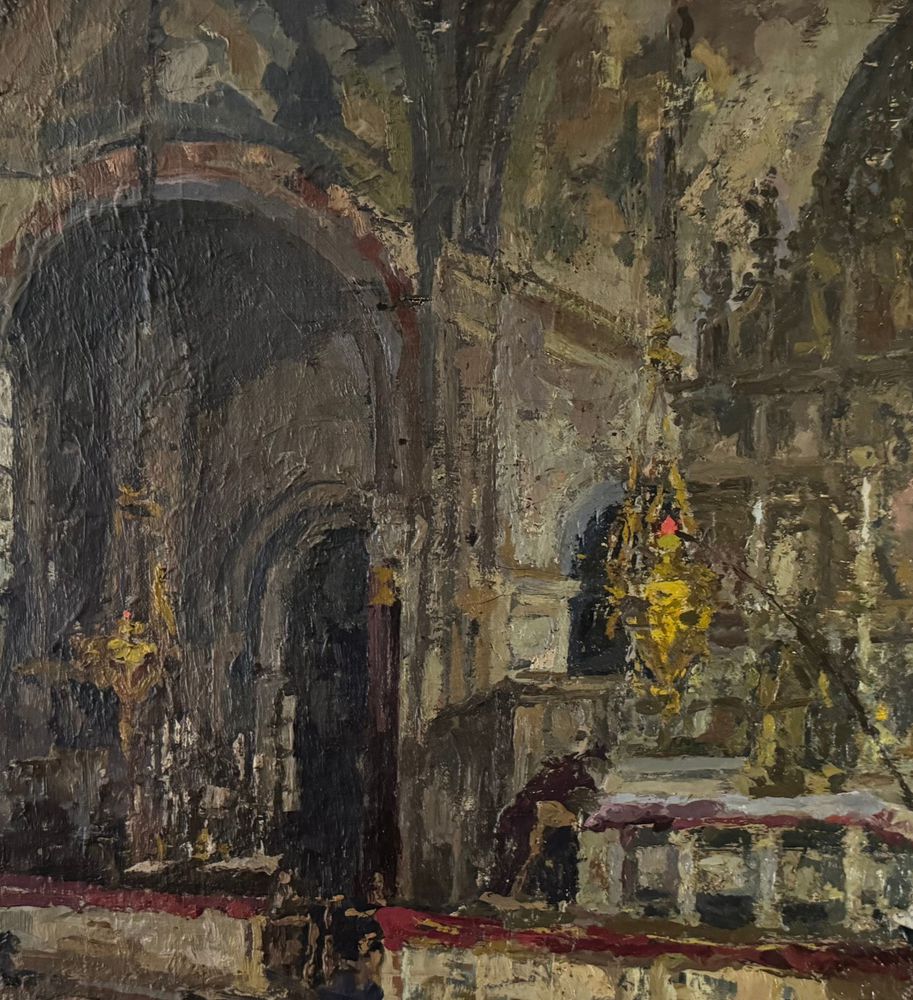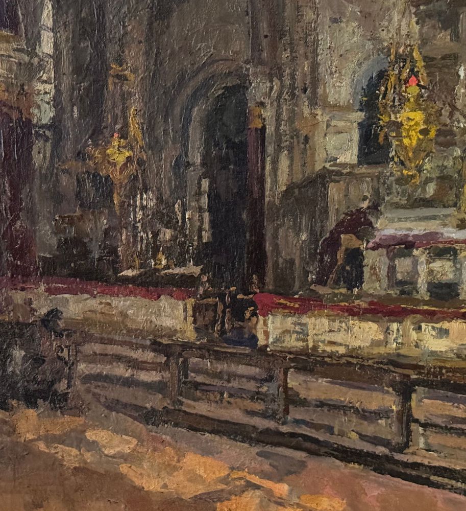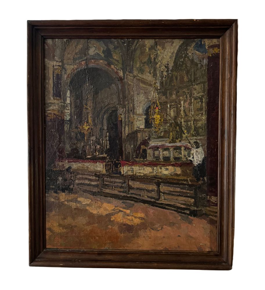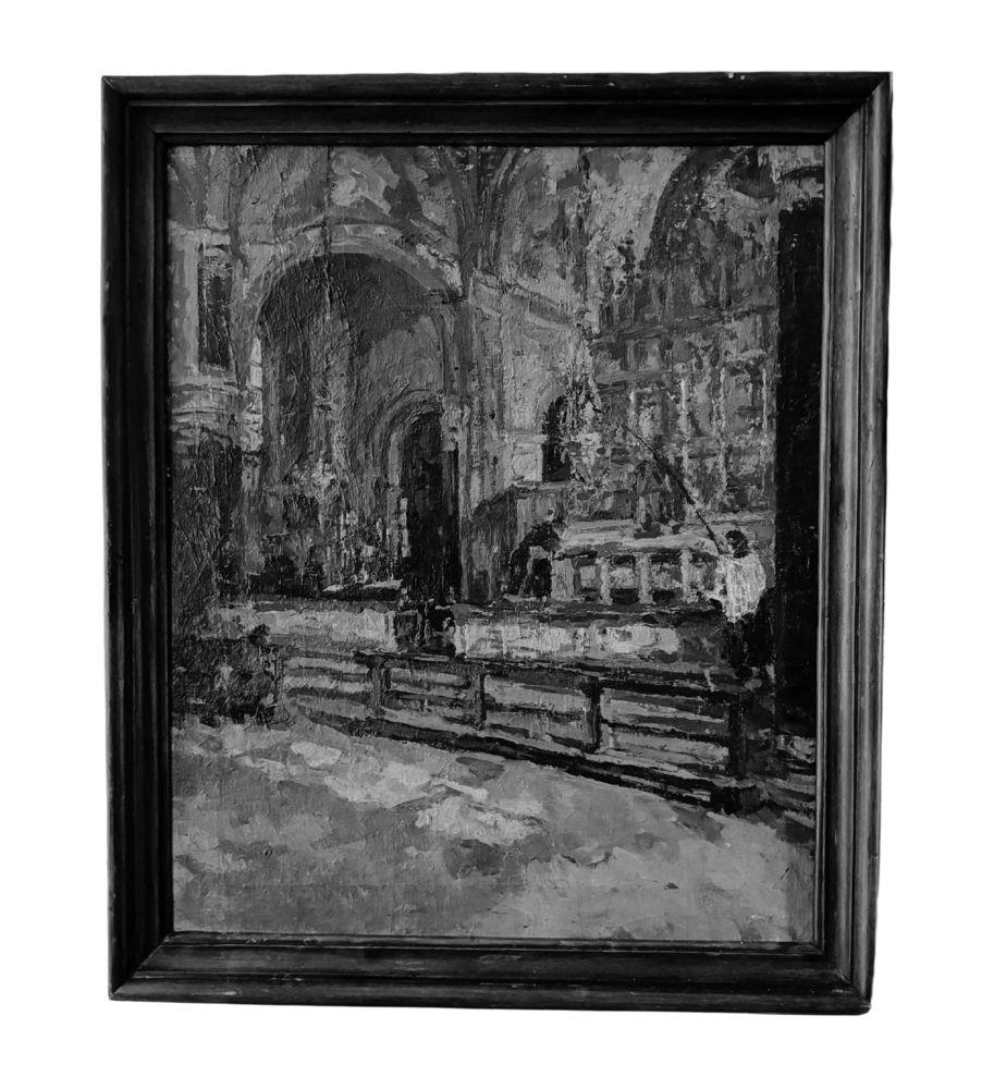 Dipinto olio su tela, periodo XIX secolo scuola Italiana, raffigurante Interno di chiesa. Dimensioni compreso cornice: 73x88 cm. Dimensioni interno cornice: 64x76 cm. Da artista anonimo. Opera in buone condizioni. Da segnalare due piccoli punti di restauro. (Probabile attribuzione a Domenico Battaglia).