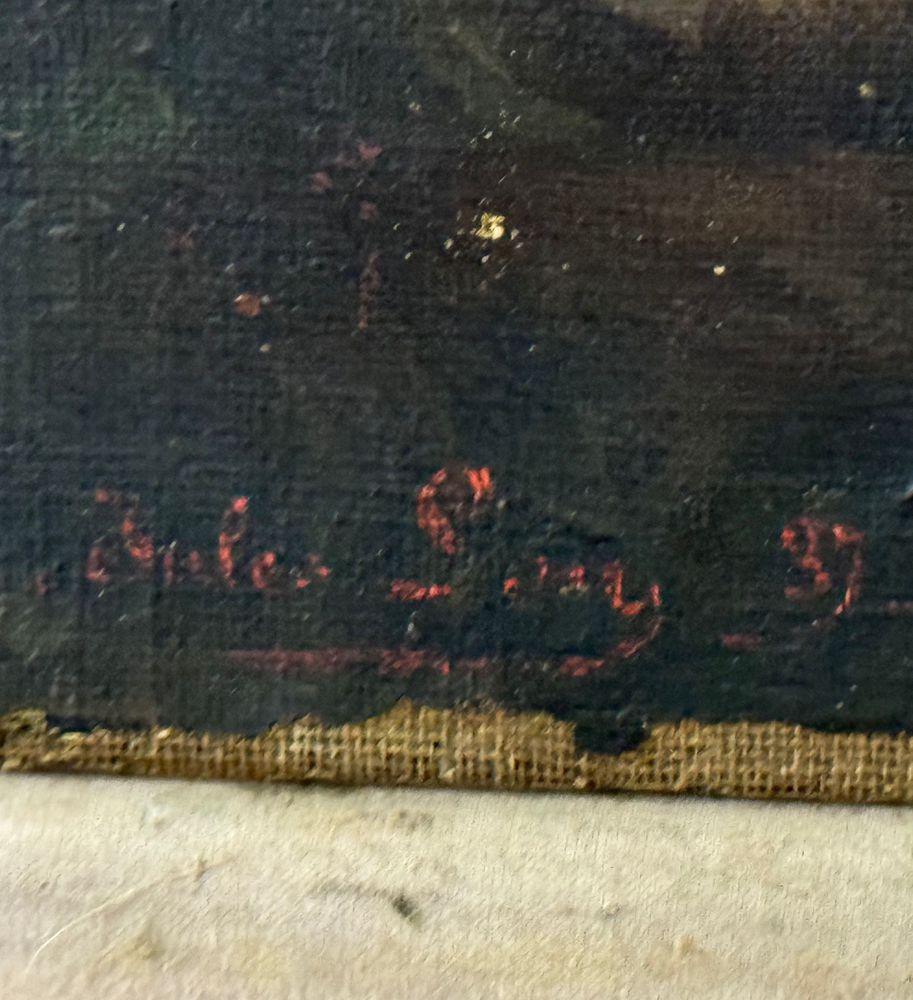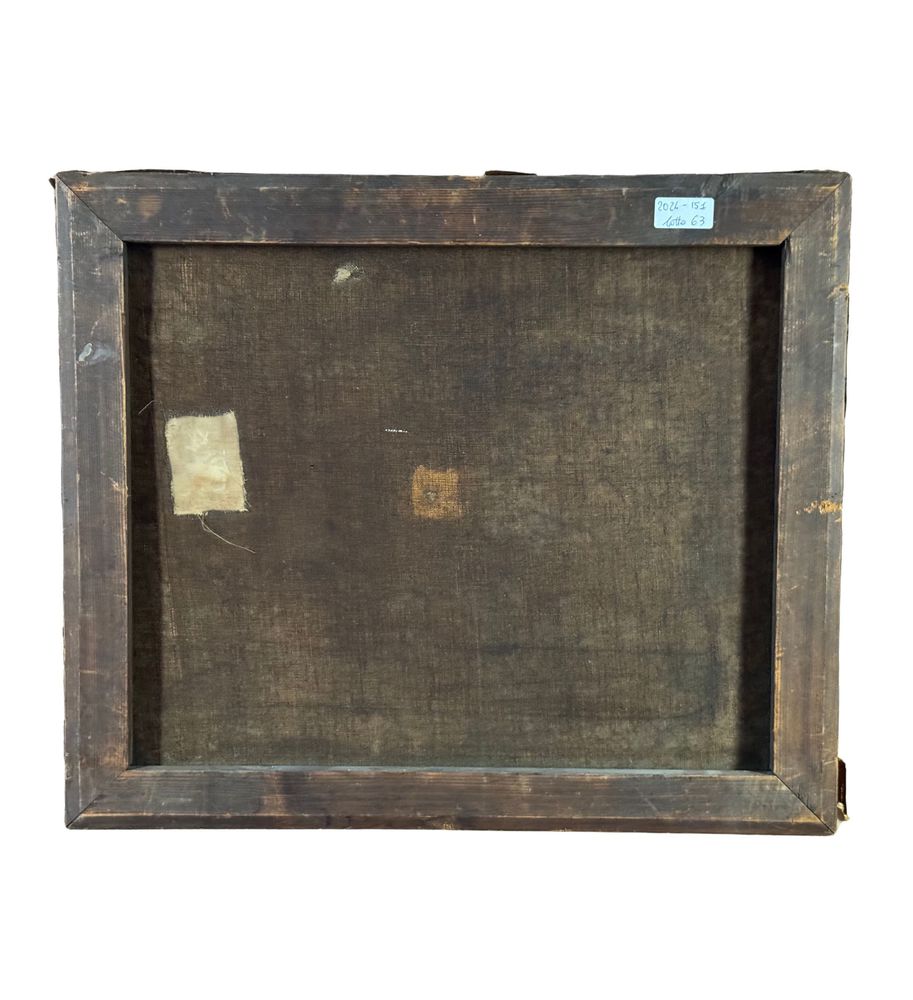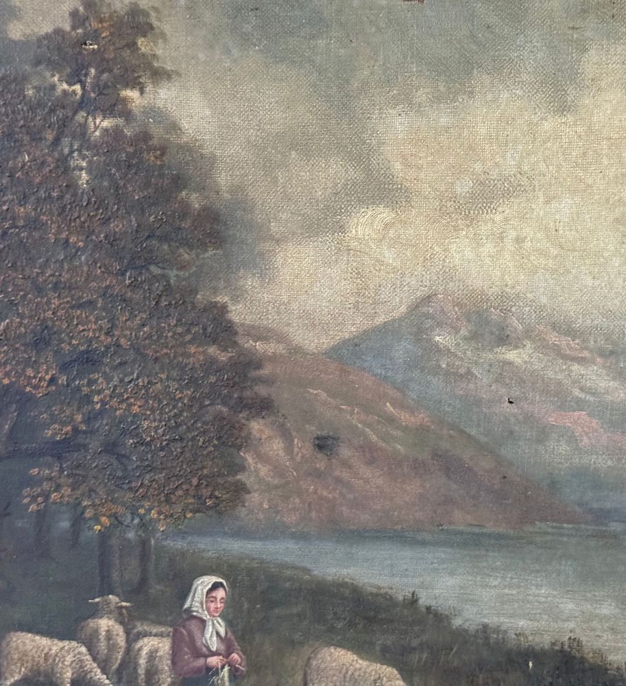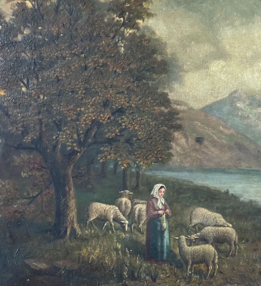 Dipinto olio su tela, periodo XIX secolo scuola Napoletana, raffigurante Personaggio con gregge. Dimensioni: 51x43 cm. Reca firma in basso a sinistra da artista non identificato. Opera in discrete condizioni con sparse cadute di colore.