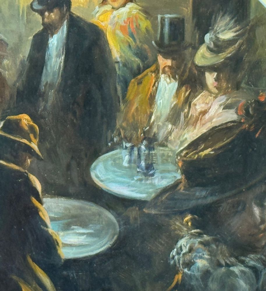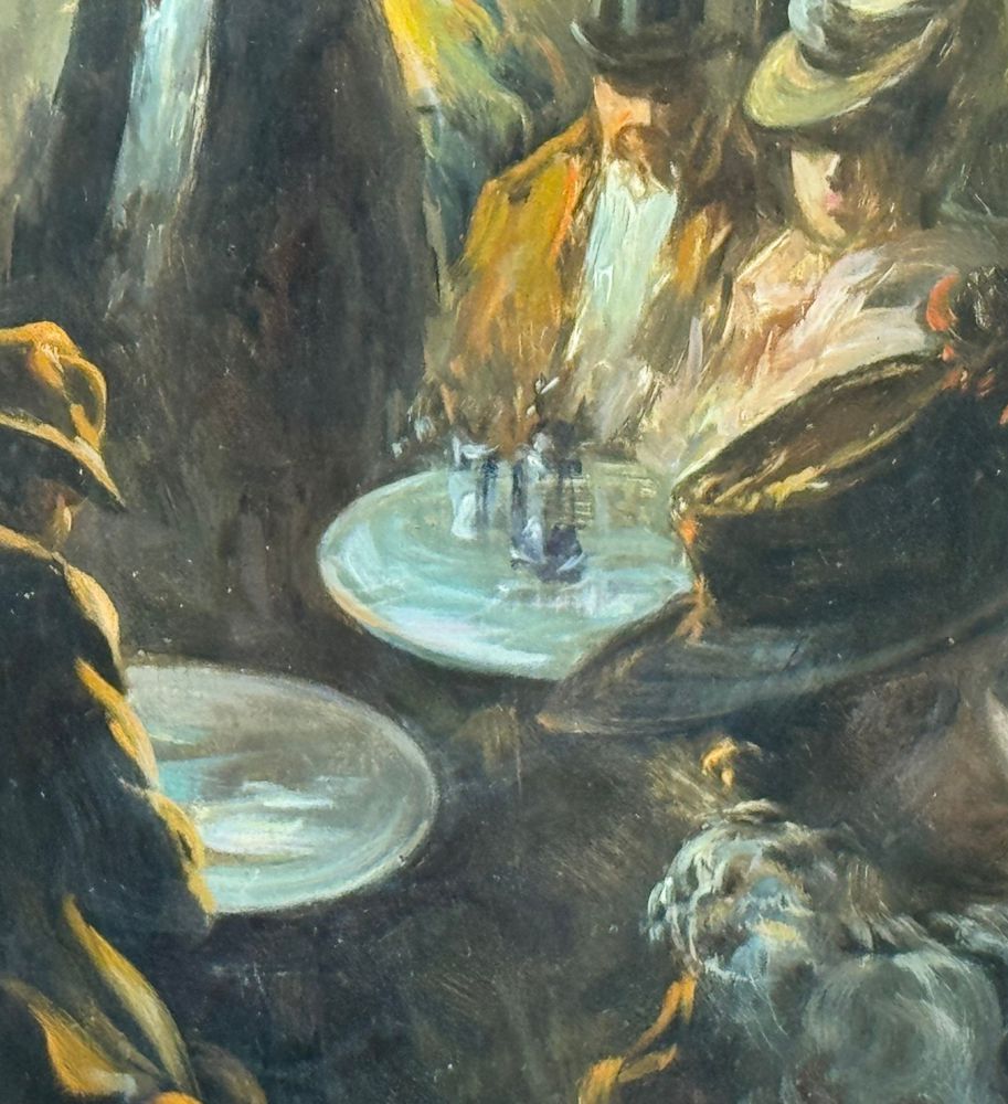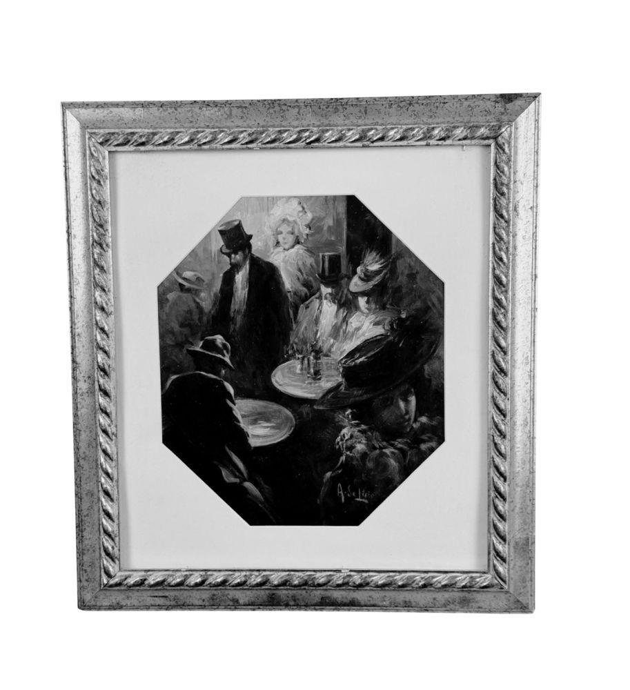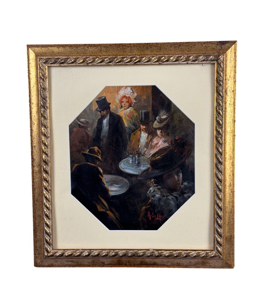 Dipinto olio su tavola, periodo XX secolo scuola Italiana, raffigurante Personaggi al bar. Dimensioni compreso cornice: 43x47 cm. Dimensioni interno cornice: 26x30 cm. Opera attribuita ad Arnaldo De Lisio, reca firma in basso a destra. Opera di forma ottagonale, in buone condizioni.