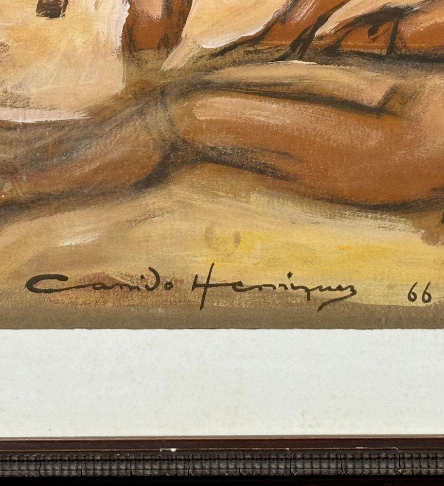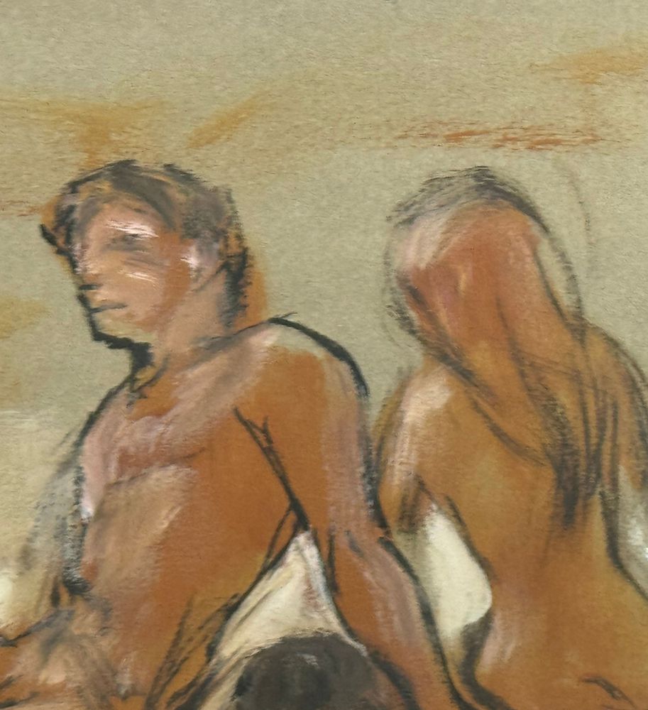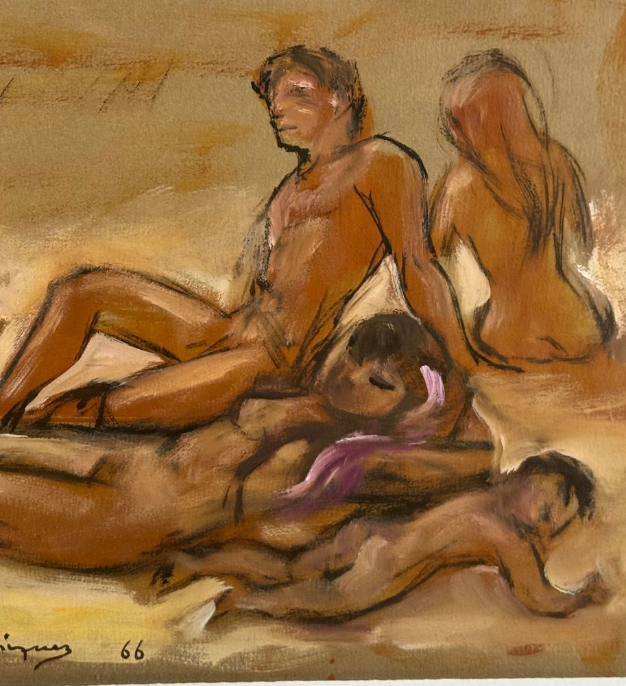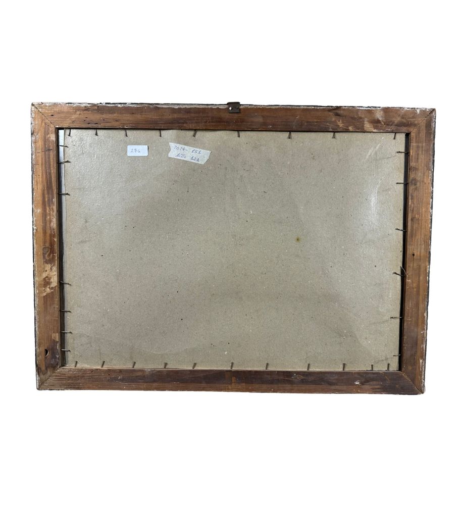 Dipinto tecnica mista su cartoncino, periodo XX secolo scuola italiana, raffigurante Personaggi su marina. Dimensioni compreso cornice: 72x52,5 cm. Dimensioni interno cornice: 50x33cm. Reca firma in basso a sinistra da artista non identificato. Opera in buone condizioni.