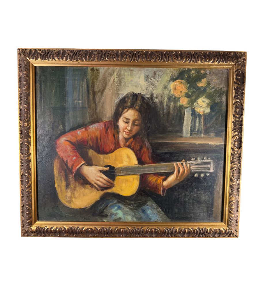 Dipinto olio su pannello, periodo XX secolo scuola Italiana, raffigurante Giovane donna con chitarra. Dimensioni compreso cornice: 86x102 cm. Dimensioni interno cornice: 70x86 cm. Da artista anonimo. Opera in buone condizioni.