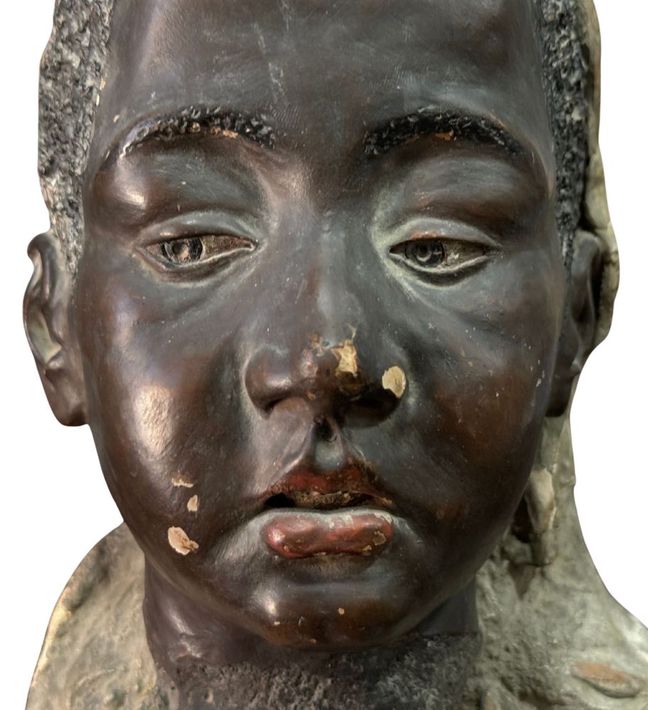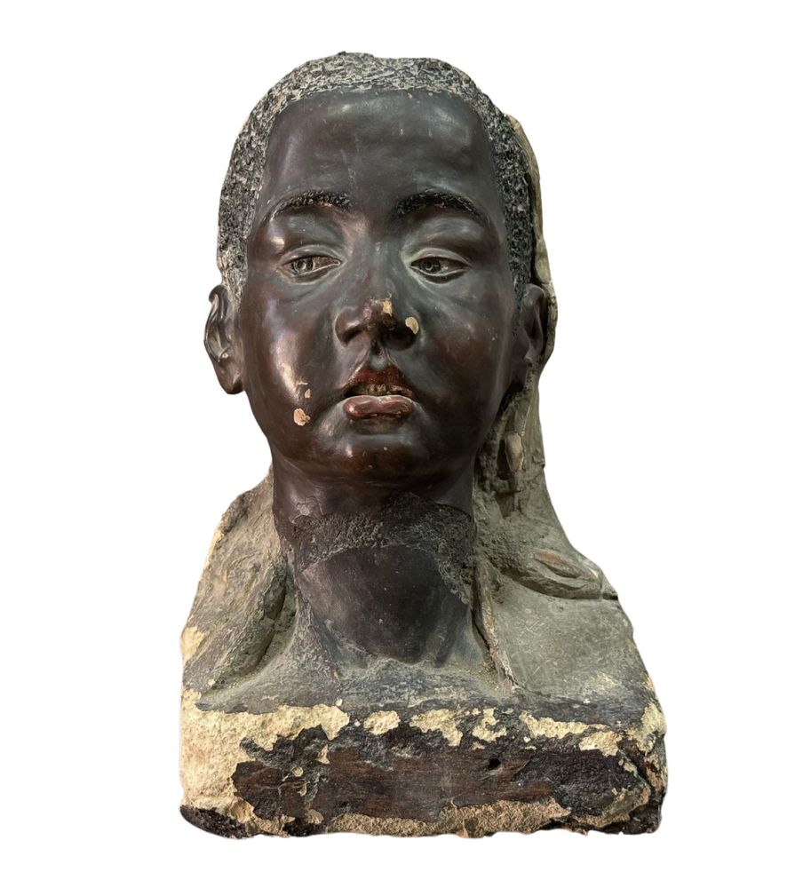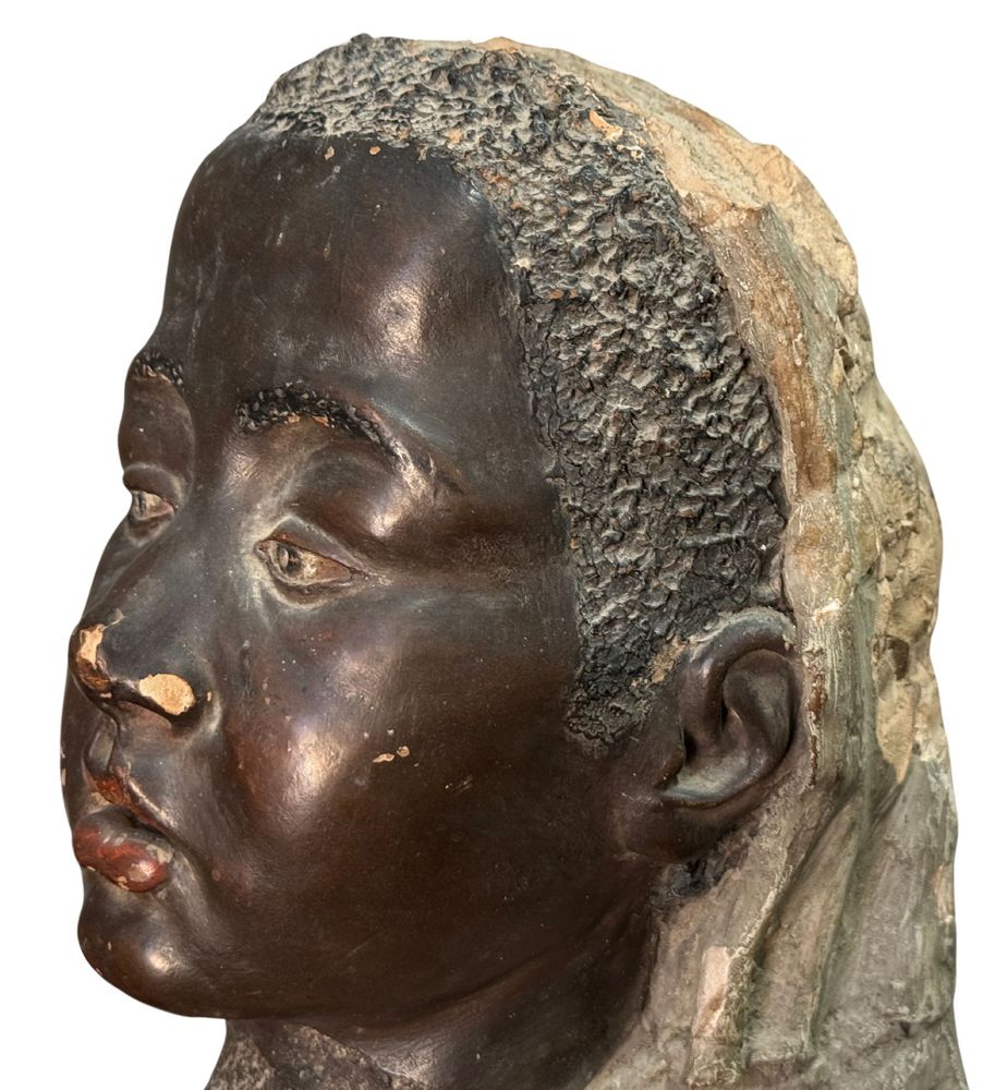 Scultura in terracotta, periodo XIX secolo, raffigurante Busto di donna africana. Dimensioni: h32x21x21 cm. Scultura integra con segni di vissuto come da foto allegate.