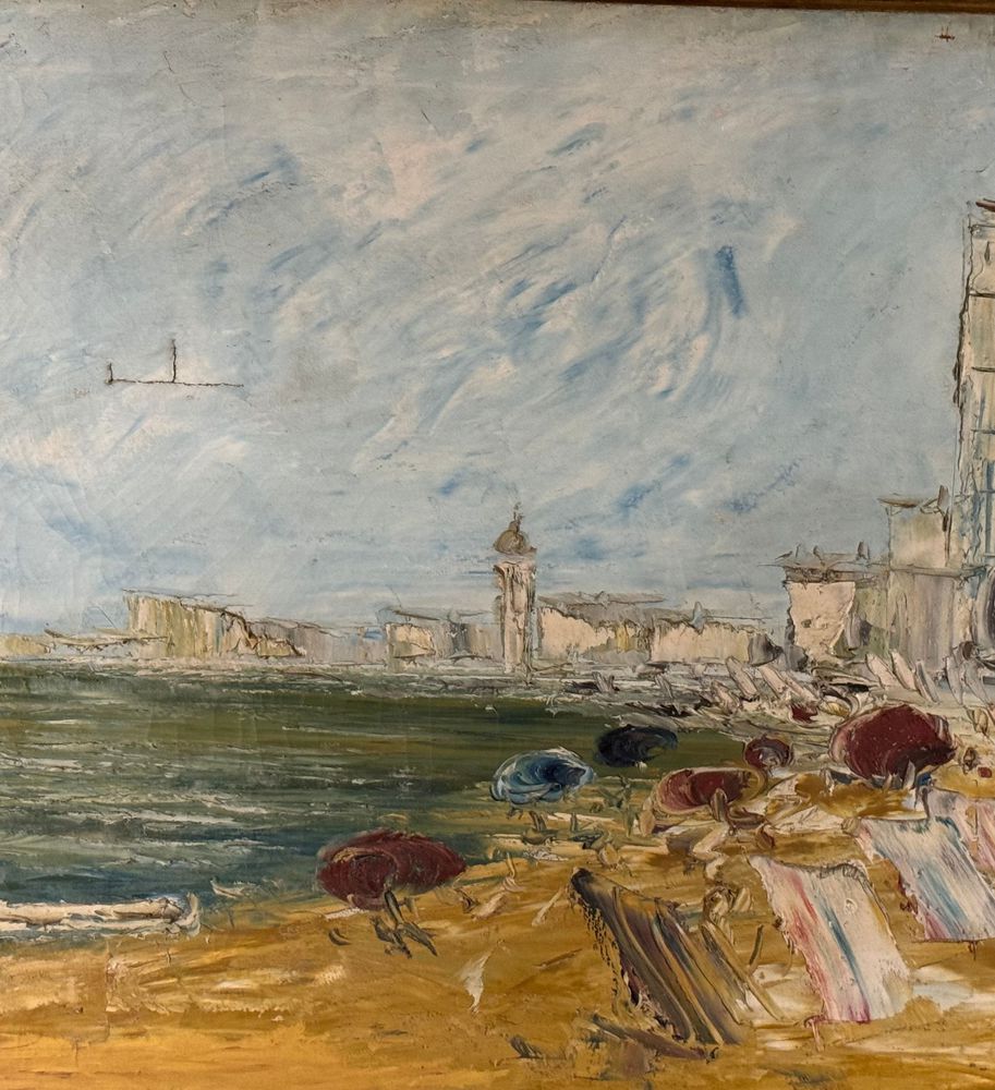 Dipinto olio su tela, periodo XX secolo scuola Italiana, raffigurante Marina con personaggi. Dimensioni compreso cornice: 150x90 cm. Dimensioni interno cornice: 120x60 cm. Da artista anonimo. Opera in buone condizioni. Da segnalare un taglio di circa 4 cm nella parte alta sinistra della tela.