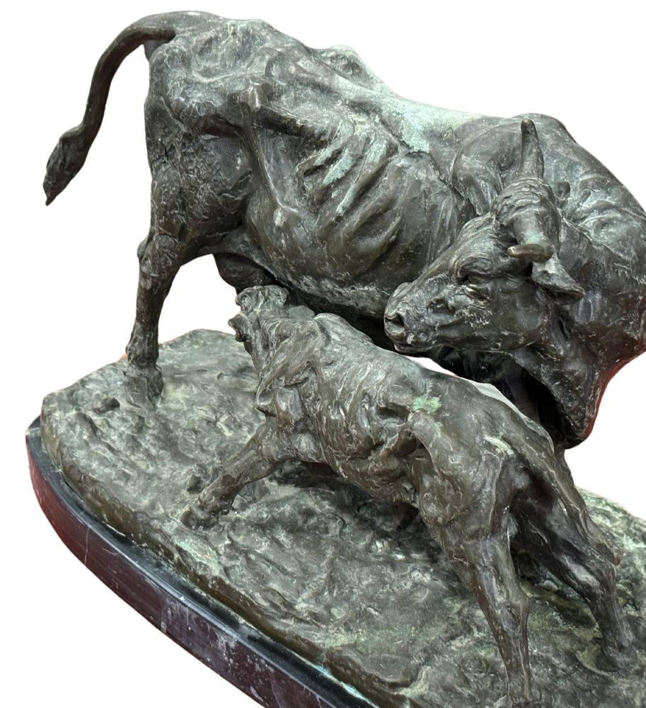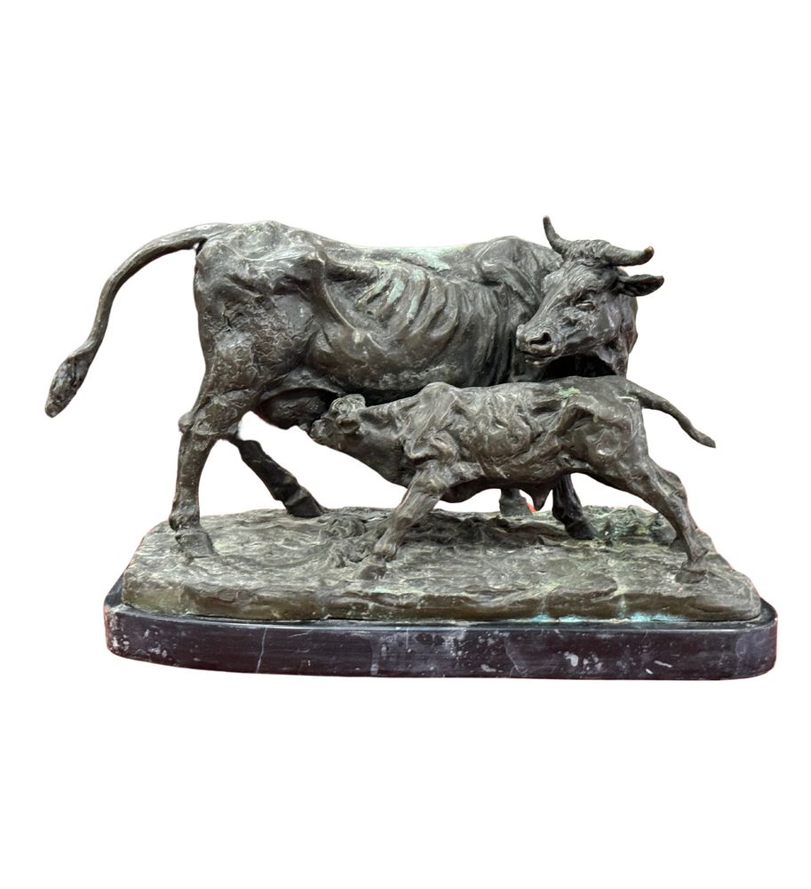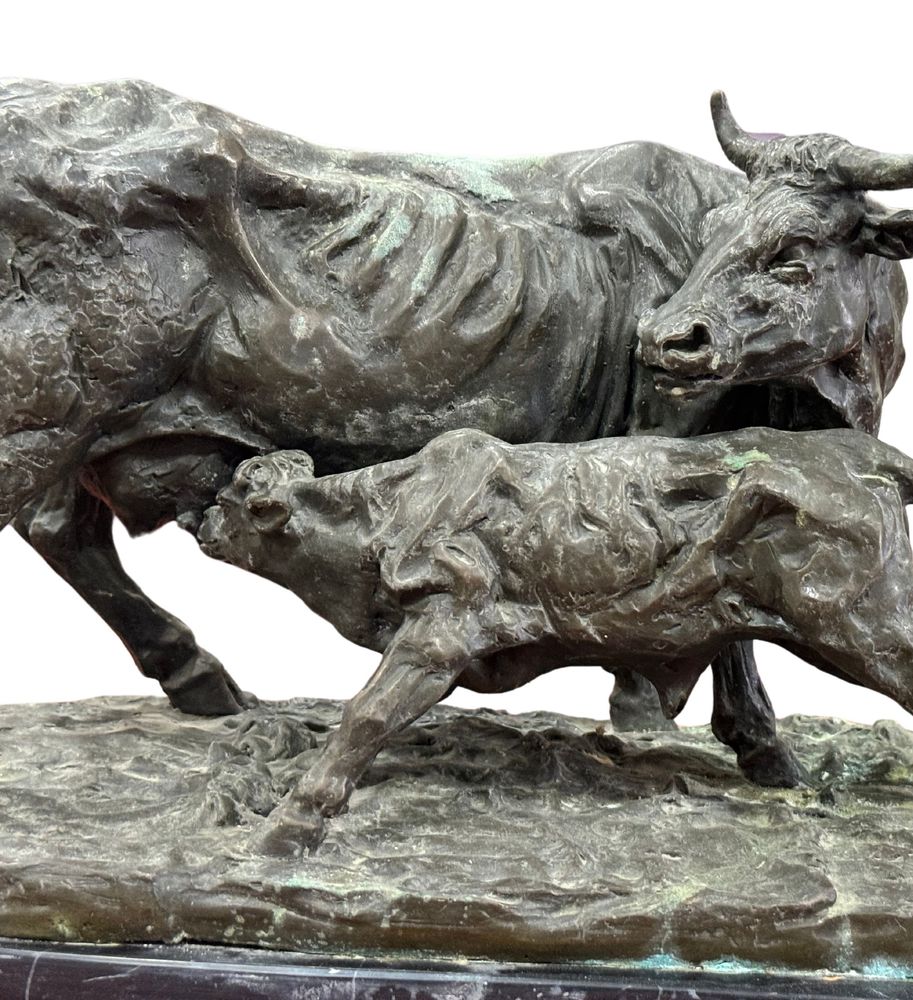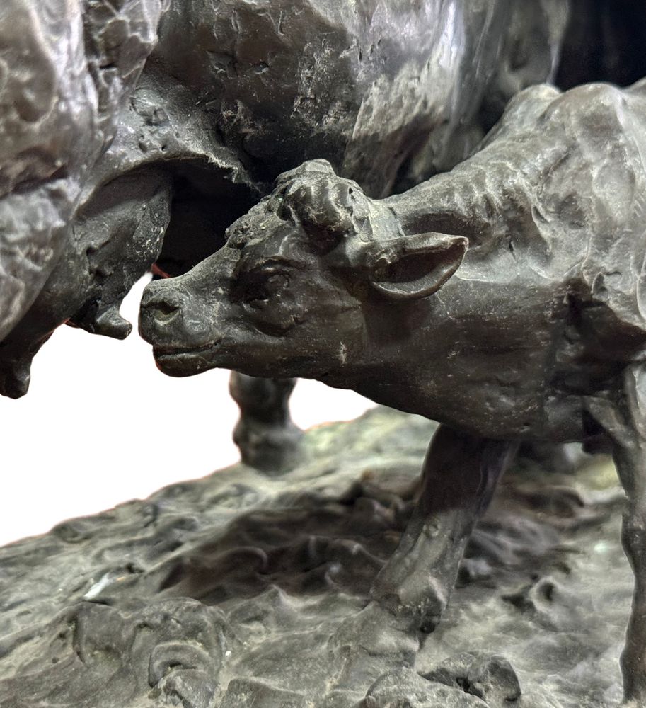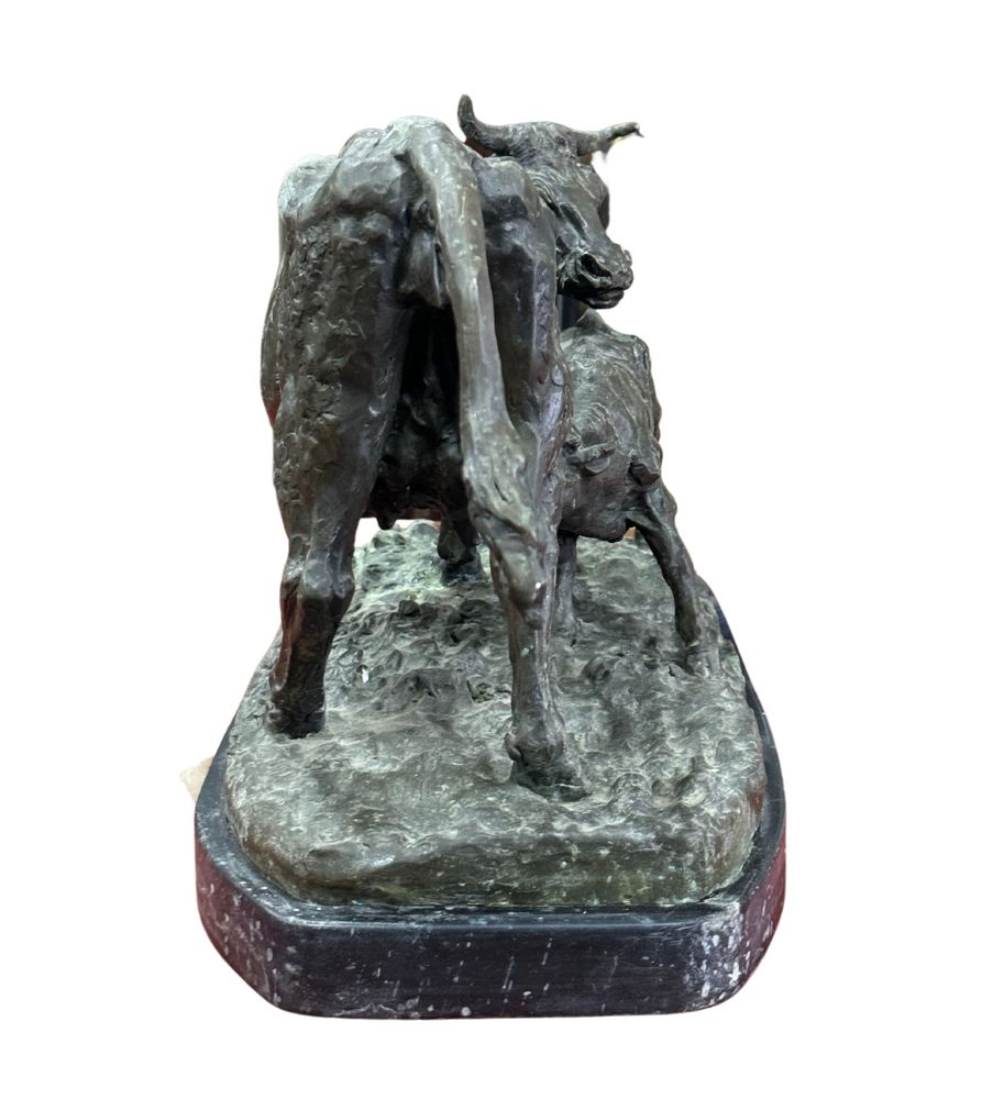 Scultura in bronzo a cera persa, periodo XIX/XX secolo, raffigurante Toro mentre allatta. Dimensioni: h25x45x18 cm. In buone condizioni e di ottima qualità artistica.