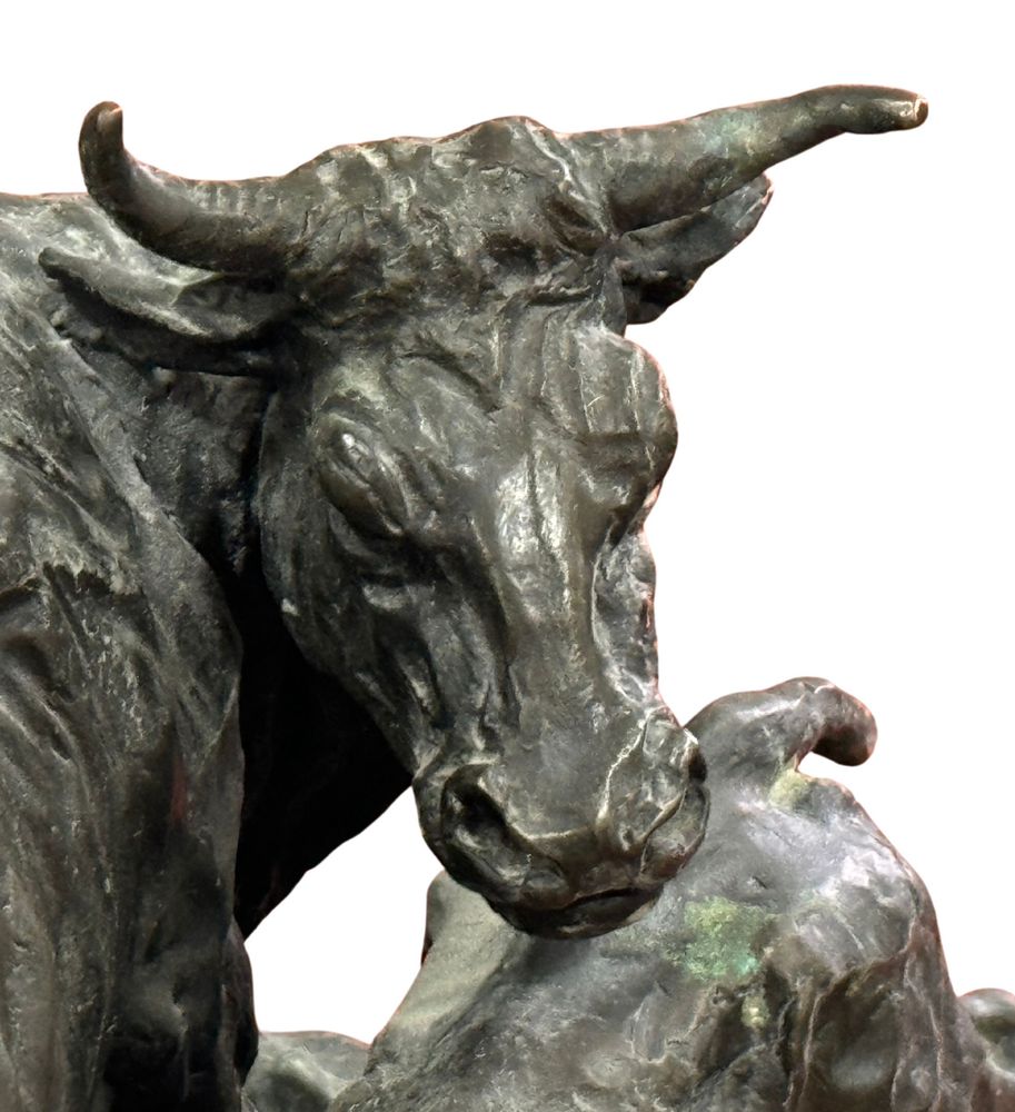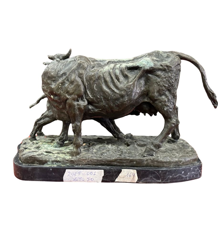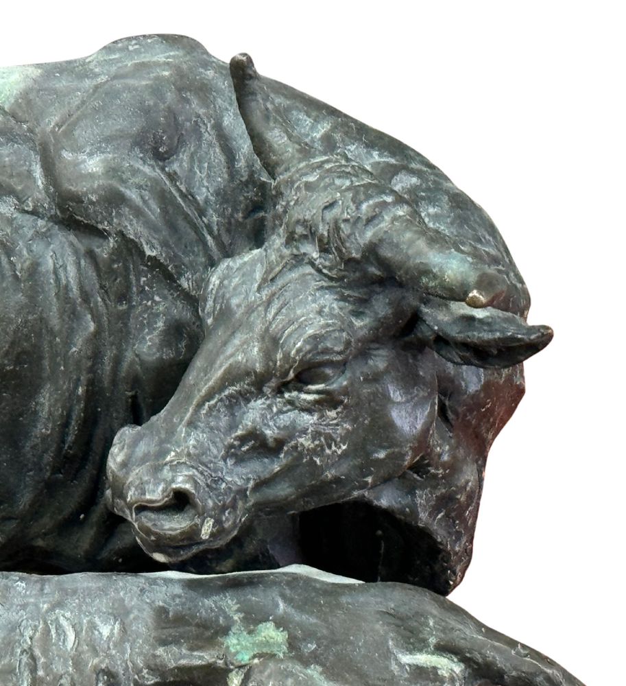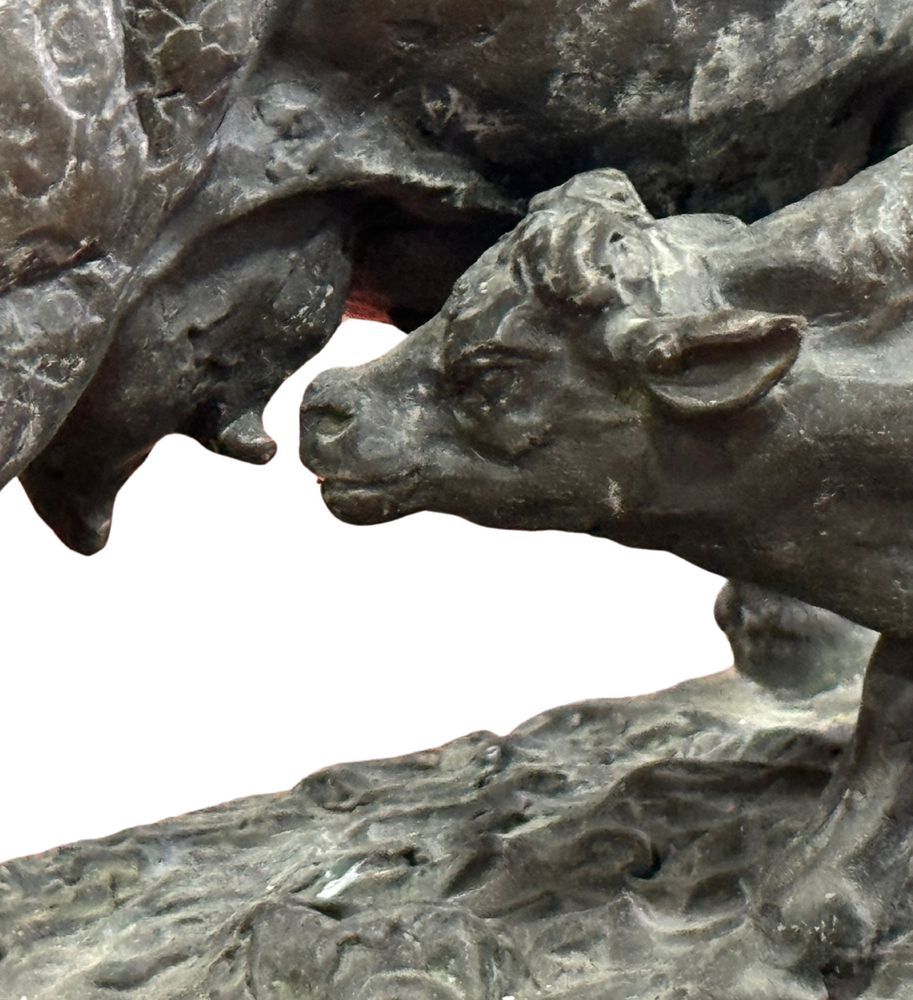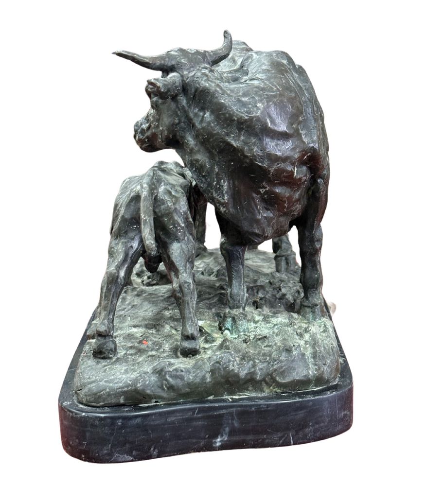 Scultura in bronzo a cera persa, periodo XIX/XX secolo, raffigurante Toro mentre allatta. Dimensioni: h25x45x18 cm. In buone condizioni e di ottima qualità artistica.